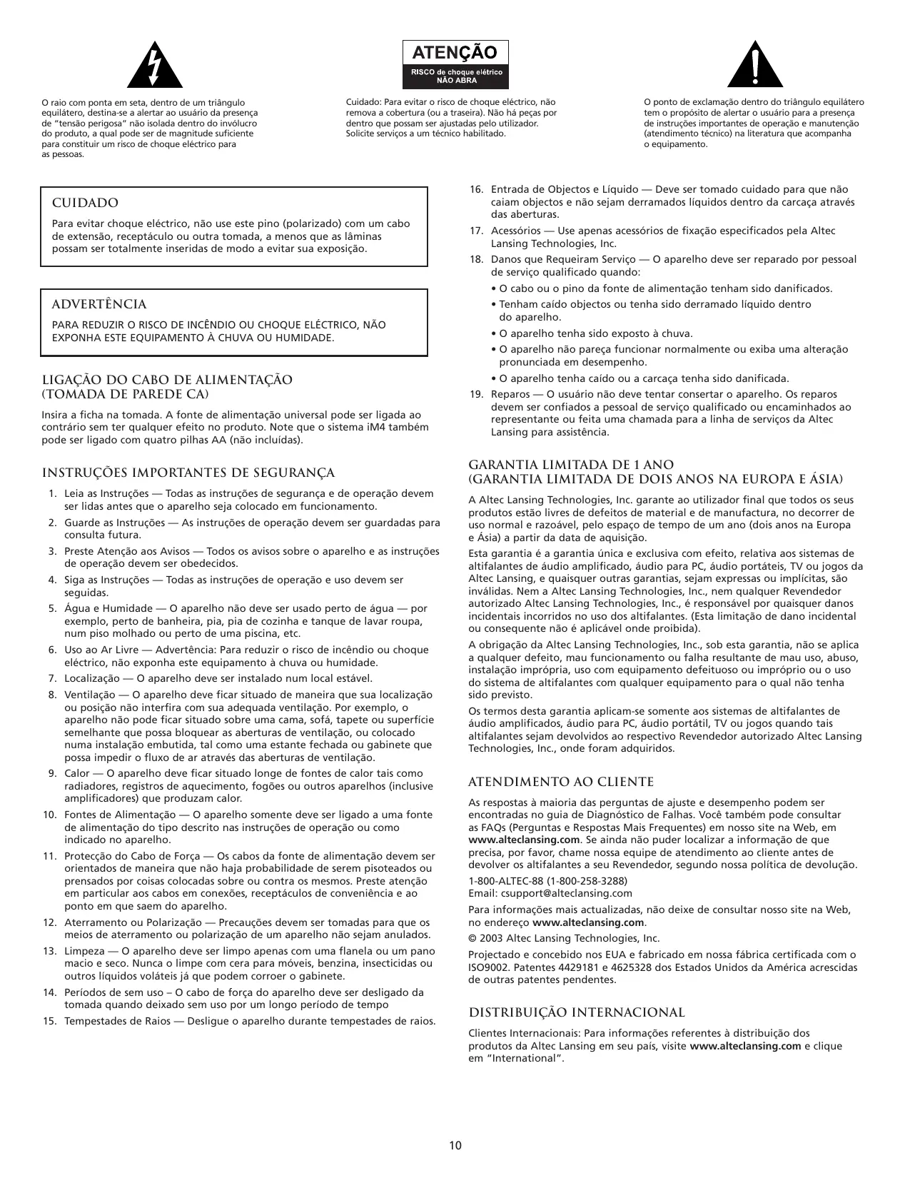 17. Acessórios — Use apenas acessórios de fixação especificados pela Altec Lansing Technologies, Inc. 18. Danos que Requeiram Serviço — O aparelho deve ser reparado por pessoal de serviço qualificado quando: • O cabo ou o pino da fonte de alimentação tenham sido danificados.