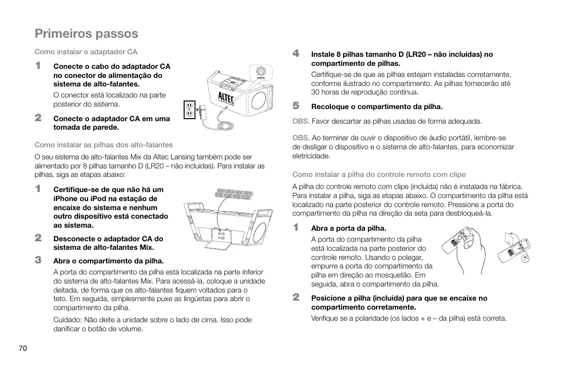 Conecte o adaptador CA em uma tomada de parede. Como instalar as pilhas dos alto-falantes O seu sistema de alto-falantes Mix da Altec Lansing também pode ser alimentado por 8 pilhas tamanho D (LR20 – não incluídas). Para instalar as pilhas, siga as etapas abaixo: