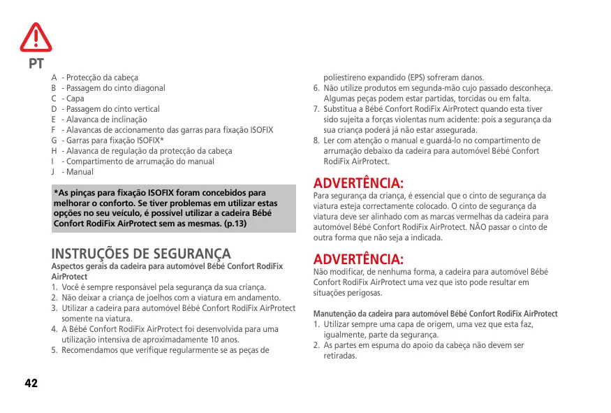 INSTRUÇÕES DE SEGURANÇA Aspectos gerais da cadeira para automóvel Bébé Confort RodiFix AirProtect 1. Você é sempre responsável pela segurança da sua criança. 2. Não deixar a criança de joelhos com a viatura em andamento. 3. Utilizar a cadeira para automóvel Bébé Confort RodiFix AirProtect somente na viatura. 4. A Bébé Confort RodiFix AirProtect foi desenvolvida para uma utilização intensiva de aproximadamente 10 anos. 5. Recomendamos que verifique regularmente se as peças de