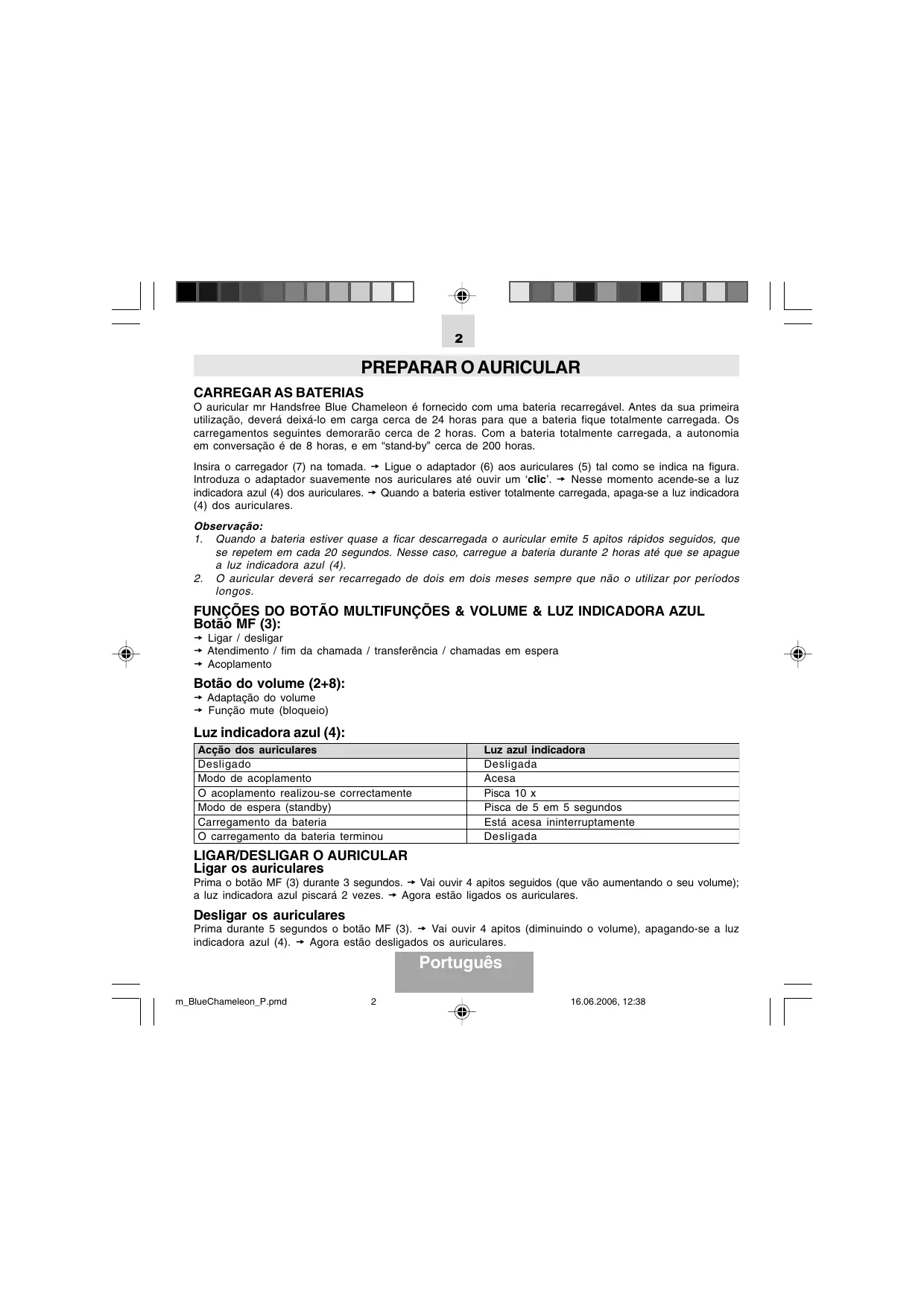 - Quando a bateria estiver quase a ficar descarregada o auricular emite 5 apitos rapiidos seguidos, que se repetem em cada 20 secondos. Nesse caso, carregue a bateria durante 2 horas até que se apague a luz indicatora azul (4).