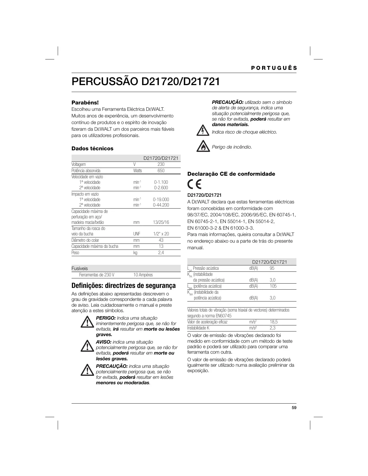 Parabéns! Escolheu uma Ferramenta Eléctrica DEWALT. Muitos anos de experiência, um desenvolvimento contínuo de produtos e o espírito de inovação fizeram da DEWALT um dos parceiros mais fiáveis para os utilizadores profissionais. Fusíveis Ferramentas de 230 V Indica risco de choque eléctrico. Perigo de incêndio. Dados técnicos Voltagem Potência absorvida Velocidade em vazio 1ª velocidade 2ª velocidade Impacto em vazio 1ª velocidade 2ª velocidade Capacidade máxima de perfuração em aço/ madeira macia/betão Tamanho da rosca do veio da bucha Diâmetro do colar Capacidade máxima da bucha Peso PRECAUÇÃO: utilizado sem o símbolo de alerta de segurança, indica uma situação potencialmente perigosa que, se não for evitada, poderá resultar em danos materiais.