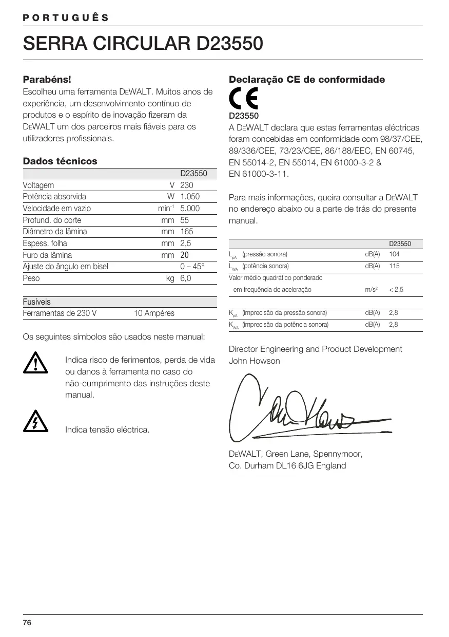 m/s2 < 2,5 Valor médio quadrático ponderado em frequência de aceleração Fusíveis Ferramentas de 230 V 10 Ampéres KpA (imprecisão da pressão sonora) dB(A) 2,8 KWA (imprecisão da potência sonora) dB(A) 2,8 Os seguintes símbolos são usados neste manual: Indica risco de ferimentos, perda de vida ou danos à ferramenta no caso do não-cumprimento das instruções deste manual. Director Engineering and Product Development John Howson Indica tensão eléctrica. DEWALT, Green Lane, Spennymoor, Co. Durham DL16 6JG England