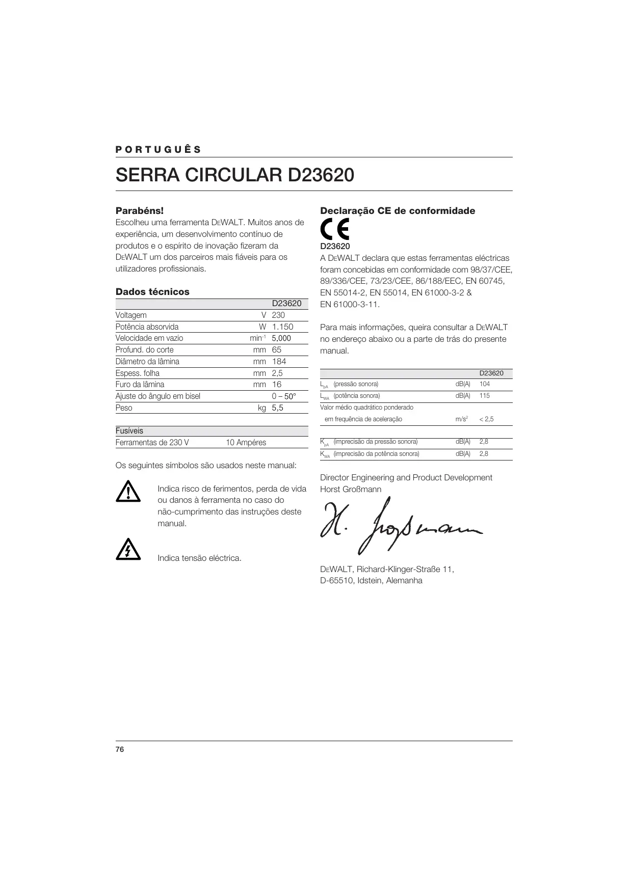 m/s2 < 2,5 KpA (imprecisão da pressão sonora) dB(A) 2,8 KWA (imprecisão da potência sonora) dB(A) 2,8 Valor médio quadrático ponderado em frequência de aceleração Fusíveis Ferramentas de 230 V 10 Ampéres Os seguintes símbolos são usados neste manual: Indica risco de ferimentos, perda de vida ou danos à ferramenta no caso do não-cumprimento das instruções deste manual. Director Engineering and Product Development Horst Großmann Indica tensão eléctrica. DEWALT, Richard-Klinger-Straße 11, D-65510, Idstein, Alemanha
