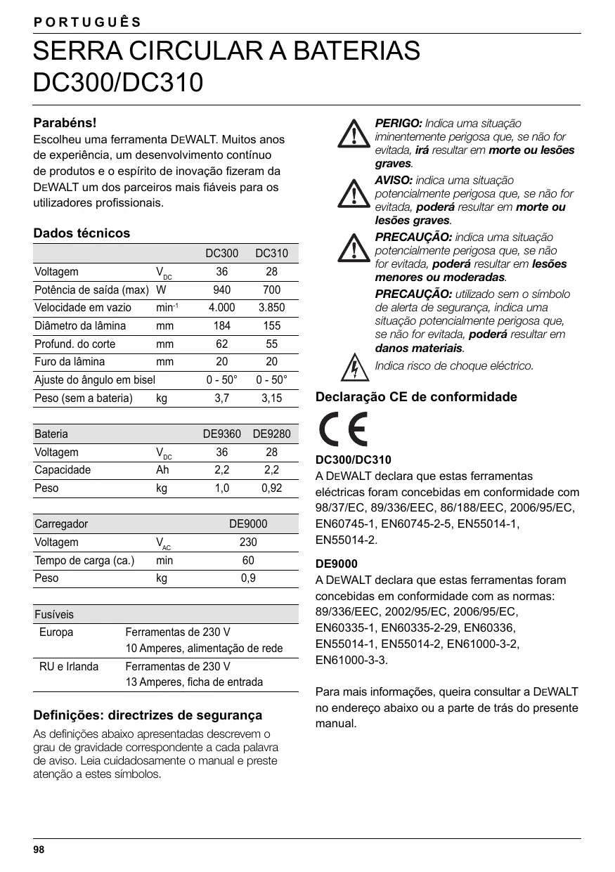 PORTUGUÊS Etiquetas no carregador e bateria Para além dos pictogramas utilizados neste manual, as etiquetas do carregador e bateria apresentam os seguintes pictogramas: Ler o manual de instruções antes de usar Para o tempo de carga veja os dados técnicos Não usar em ambientes húmidos Não tocar nos terminais com objectos condutores Não carregar baterias danificadas 1 Chave Allen 1 Bateria (DC300K/DC310K) 2 Baterias (DC300KL/DC310KL) 1 Carregador 1 Caixa de transporte (apenas modelos K) 1 Manual de instruções 1 Vista dos componentes destacados Nota: Os modelos-N não incluem baterias nem carregadores. ● Verifique se a ferramenta, as peças ou os acessórios apresentam sinais de danos que possam ter ocorrido durante o transporte. ● Antes de utilizar a ferramenta, dedique o tempo necessário à leitura e compreensão deste manual. Descrição (fig. A) AVISO: Nunca modifique a ferramenta eléctrica ou qualquer uma das suas peças. Podem ocorrer danos ou lesões. Não utilizar carregadores danificados Carregar só entre 4 °C e 40 °C Substituir imediatamente cabos defeituosos Problema no carregador Problema na bateria Descartar a bateria tendo em atenção o meio ambiente Não incinerar a bateria Utilizar apenas carregadores DEWALT exclusivos Verificação do conteúdo da embalagem A embalagem contém: 1 Serra circular a baterias 1 Lâmina (DT1211)