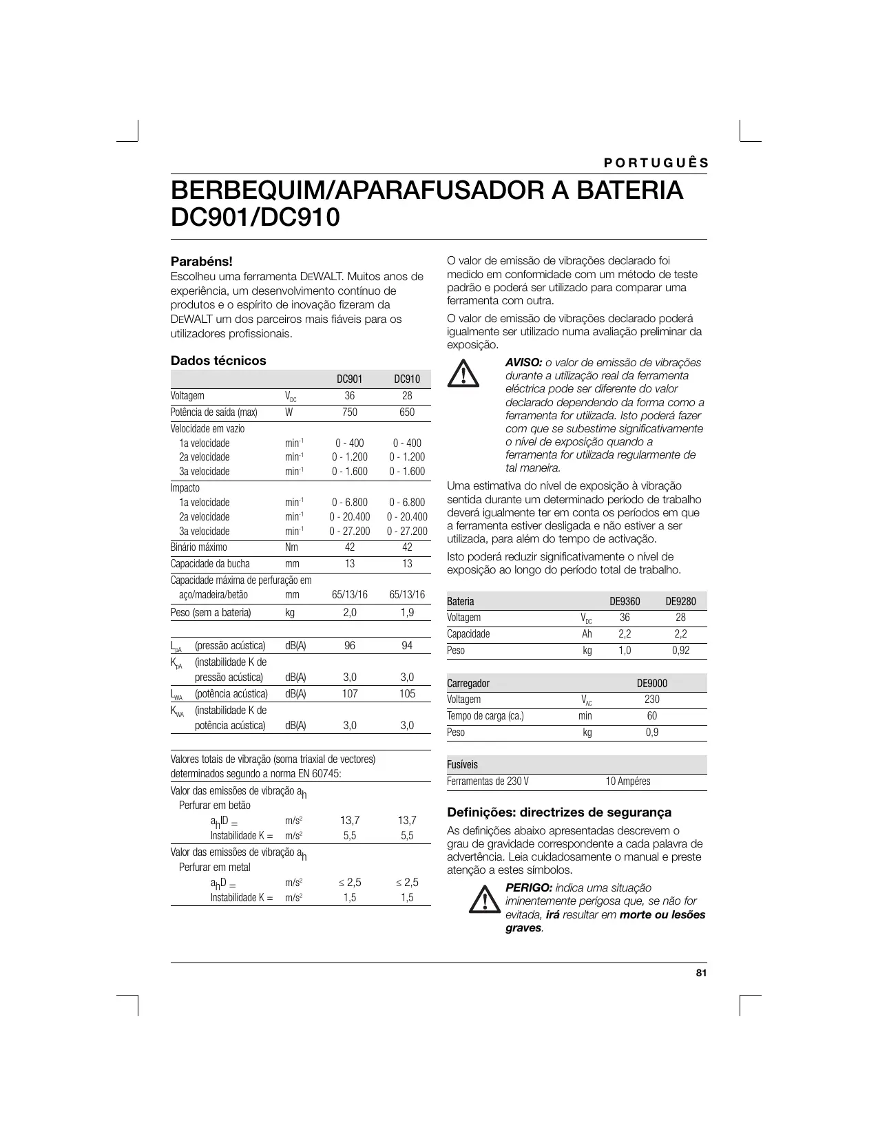 DC901/DC910 Parabéns! Escolheu uma ferramenta DEWALT. Muitos anos de experiëncia, um desenvoivimento continuo de produtos e o espirito de inovaçäo fizeram da DEWALT um dos parceiros mais fiâveis para os utilizadores profissionais. Dados técnicos DC901 DC910 Voragem Ve E 2 Poréncia de said (ma) W 750 650 Velocidade em vazio a velocidade min 0-40 0-400 2a velocidade mini 0-1200 0-1.200 Sa velocidade mini 0-1600 O-1.600 impacto a velocidade min 0-6800 0-6.800 2a velocidade min 0-20400 0-20400 Sa velocidade min O-27.200 0-27.200 Bindro mémo Nm Æ az Capacidade da bucha rm E E Capacidade mâma de periuraçéo em aço/madera/betäo ram 651316 65/1316 Peso (sem a bateria) kg 20 19 La (pressäo acüstica) dB(A) 96 cn K: (instabilidade K de pressäo acüstica) dB(A) 30 30 Lu (poténcia acüstica) dB(A) 107 105 Ka (nstablidade K de poténcia acistica) dB(A) 30 30 Valores totais de vibraçäo (soma triaxal de vectores) determinados segundo a norma EN 60745: Valor das emissôes de vibraçäo a Perfurar em betäo af) = m/s 13,7 13,7 Instabilidade K = m/s? 5,5 5,5 Valor das emissées de vibraçäo 4}, Perfurar em metal ap = ms 25 <25 Instabildade K = m/s° 15 15 O valor de emissäo de vibraçôes declarado foi medido em conformidade com um método de teste padréo e poderä ser utllzado para comparar uma ferramenta com outra. O valor de emissäo de vibraçôes declarado poderä iguaimente ser utilizado numa avaliaçäo prelminar da exposiçäo AVISO: o valor de emissäo de vibraçôes VAN durante a utilzaçäo real da ferramenta eléctrica pode ser diferente do valor declarado dependend da forma como a feramenta for utlizada. Isto oder fazer com que se subestime significativamente nivel de exposigäo quando a ferramenta for utiizada regularmente de tal manera. Uma estimativa do nivel de exposiçäo à vibraçäo sentida durante um determinado periodo de trabalho deverä igualmente ter em conta os periodos em que à ferramenta estiver desligada e no estiver a ser utiizada, para além do tempo de activaçäo. Isto poderä reduzir significativamente o nivel de exposiçäo ao longo do periodo total de trabalho. Bateria DE9360 DE9280 Voltagem VW #% 2 Capacidade Ah 22 22 Peso CE 092 Carregador DE9000 Voltagem Ve 230 Tempo de carga (ca) min 60 Peso K 09 Fusiveis Ferramentas de 230V TO Ampéres Definiçôes: directrizes de segurança As definigées abaixo apresentadas descrevem o grau de gravidade correspondente a cada palavra de adverténcia. Leia cuidadosamente o manual e preste atençäo a estes simbolos. PERIGO: indica uma situaçäo VAN iminentemente perigosa que, se näo for evitade, ir resultar em morte ou lesôes graves.