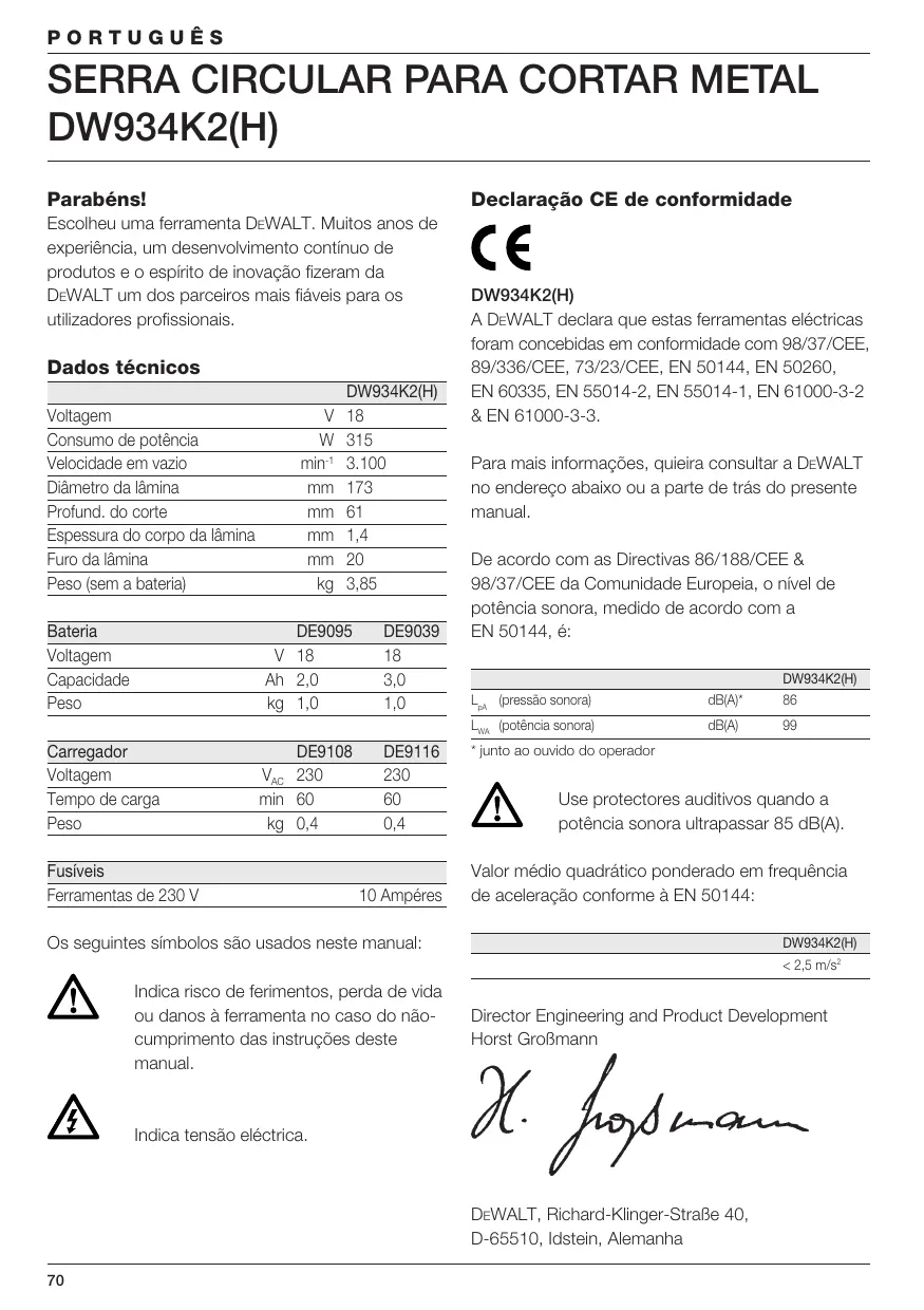 DW934K2(H) Parabéns! Escolheu uma ferramenta DEWALT. Muitos anos de experiëncia, um desenvolvimento continuo de produtos e o espirito de inovaçäo fizeram da DEWALT um dos parceiros mais fiâveis para os utiizadores profissionais. Dados técnicos Declaraçäo CE de conformidade