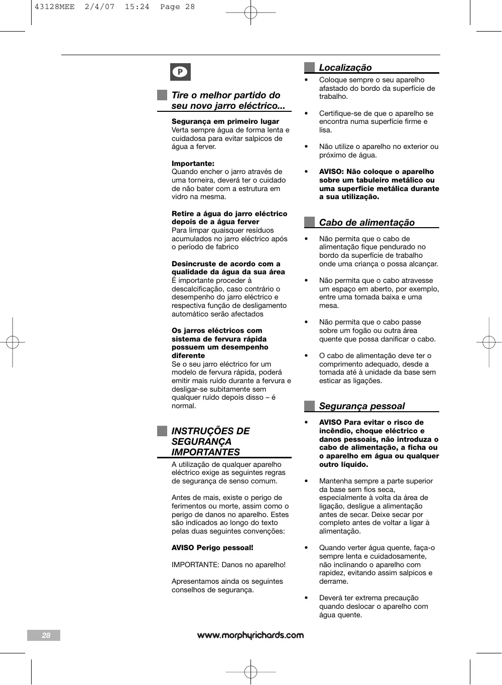 p Os produtos Morphy Richards foram concebidos apenas para utilizaçãodoméstica. A Morphy Richards respeita uma política de aperfeiçoamento contínuo daqualidade e design do produto. Desta forma, a companhia reserva-se o direitode alterar as especificações destes modelos a qualquer momento.