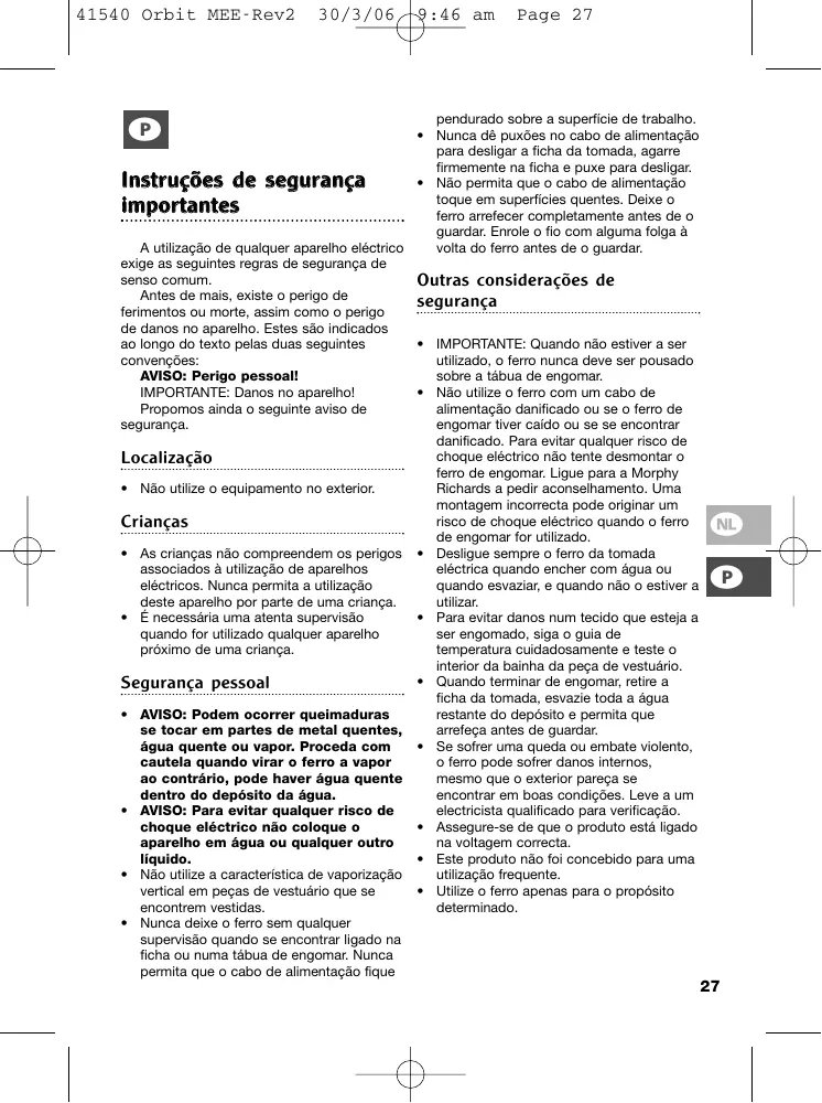 pendurado sobre a superfície de trabalho. • Nunca dê puxões no cabo de alimentação para desligar a ficha da tomada, agarre firmemente na ficha e puxe para desligar. • Não permita que o cabo de alimentação toque em superfícies quentes. Deixe o ferro arrefecer completamente antes de o guardar. Enrole o fio com alguma folga à A utilização de qualquer aparelho eléctrico volta do ferro antes de o guardar. exige as seguintes regras de segurança de senso comum. Outras considerações de Antes de mais, existe o perigo de segurança ferimentos ou morte, assim como o perigo de danos no aparelho. Estes são indicados • IMPORTANTE: Quando não estiver a ser ao longo do texto pelas duas seguintes utilizado, o ferro nunca deve ser pousado convenções: sobre a tábua de engomar. AVISO: Perigo pessoal! IMPORTANTE: Danos no aparelho! • Não utilize o ferro com um cabo de Propomos ainda o seguinte aviso de alimentação danificado ou se o ferro de segurança. engomar tiver caído ou se se encontrar danificado. Para evitar qualquer risco de choque eléctrico não tente desmontar o Localização ferro de engomar. Ligue para a Morphy • Não utilize o equipamento no exterior. Richards a pedir aconselhamento. Uma montagem incorrecta pode originar um risco de choque eléctrico quando o ferro Crianças de engomar for utilizado. • As crianças não compreendem os perigos • Desligue sempre o ferro da tomada associados à utilização de aparelhos eléctrica quando encher com água ou eléctricos. Nunca permita a utilização quando esvaziar, e quando não o estiver a deste aparelho por parte de uma criança. utilizar. • É necessária uma atenta supervisão • Para evitar danos num tecido que esteja a quando for utilizado qualquer aparelho ser engomado, siga o guia de próximo de uma criança. temperatura cuidadosamente e teste o interior da bainha da peça de vestuário. • Quando terminar de engomar, retire a Segurança pessoal ficha da tomada, esvazie toda a água • AVISO: Podem ocorrer queimaduras restante do depósito e permita que se tocar em partes de metal quentes, arrefeça antes de guardar. água quente ou vapor. Proceda com • Se sofrer uma queda ou embate violento, cautela quando virar o ferro a vapor o ferro pode sofrer danos internos, ao contrário, pode haver água quente mesmo que o exterior pareça se dentro do depósito da água. encontrar em boas condições. Leve a um • AVISO: Para evitar qualquer risco de electricista qualificado para verificação. choque eléctrico não coloque o • Assegure-se de que o produto está ligado aparelho em água ou qualquer outro na voltagem correcta. líquido. • Este produto não foi concebido para uma • Não utilize a característica de vaporização utilização frequente. vertical em peças de vestuário que se • Utilize o ferro apenas para o propósito encontrem vestidas. determinado. • Nunca deixe o ferro sem qualquer supervisão quando se encontrar ligado na ficha ou numa tábua de engomar. Nunca permita que o cabo de alimentação fique