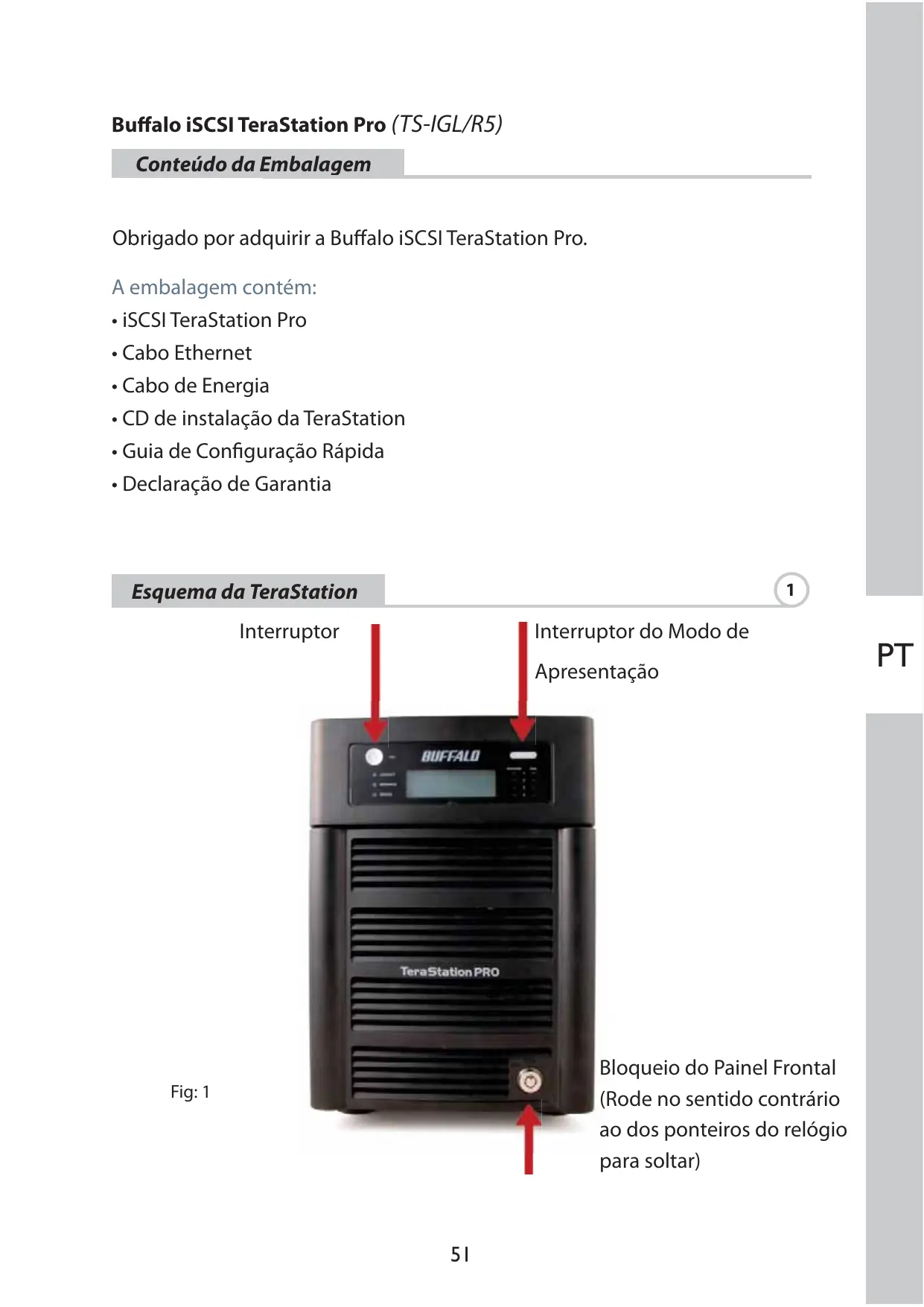 Buffalo iSCSI TeraStation Pro (TS-IGL/R5) Conteúdo da Embalagem Obrigado por adquirir a Buffalo iSCSI TeraStation Pro. A embalagem contém: • iSCSI TeraStation Pro • Cabo Ethernet • Cabo de Energia • CD de instalação da TeraStation • Guia de Configuração Rápida • Declaração de Garantia
