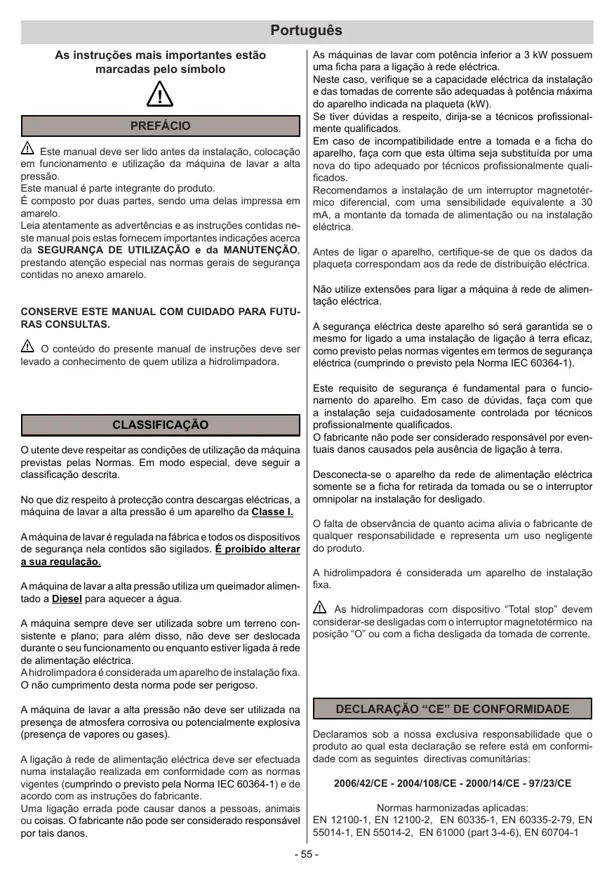 ! PREFÁCIO ! Este manual deve ser lido antes da instalação, colocação em funcionamento e utilização da máquina de lavar a alta pressão. Este manual é parte integrante do produto. É composto por duas partes, sendo uma delas impressa em amarelo. Leia atentamente as advertências e as instruções contidas neste manual pois estas fornecem importantes indicações acerca da SEGURANÇA DE UTILIZAÇÃO e da MANUTENÇÃO, prestando atenção especial nas normas gerais de segurança contidas no anexo amarelo.