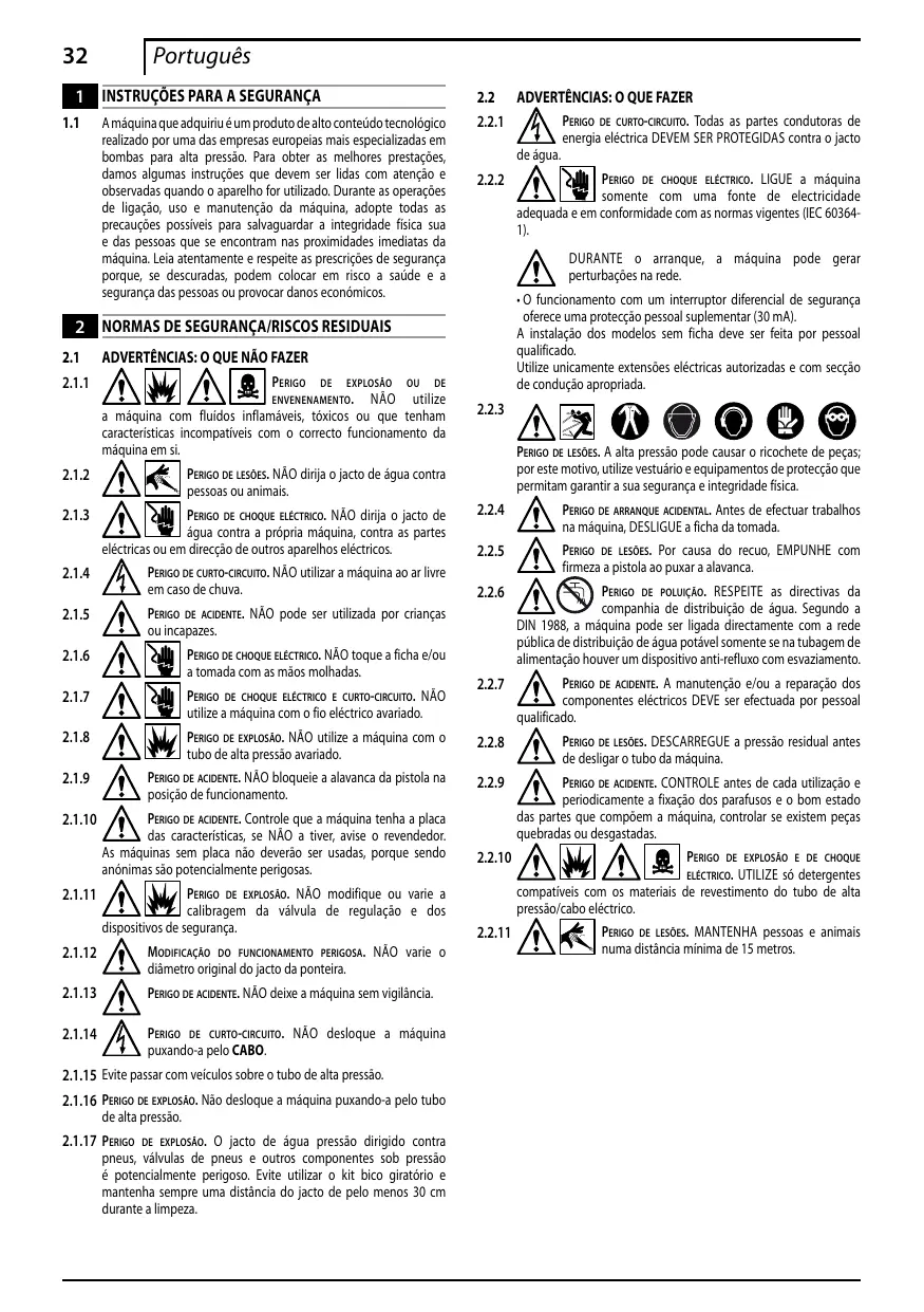 2.2.1 • Dans ce cas, le fonctionnement avec un disjoncteur différentiel de sécurité offre une protection personnelle supplémentaire (30 mA). Sur les modèles sans fiche, l'installation doit être effectuée par du personnel qualifié. N’utilisez que des rallonges électriques autorisées et avec une section appropriée.