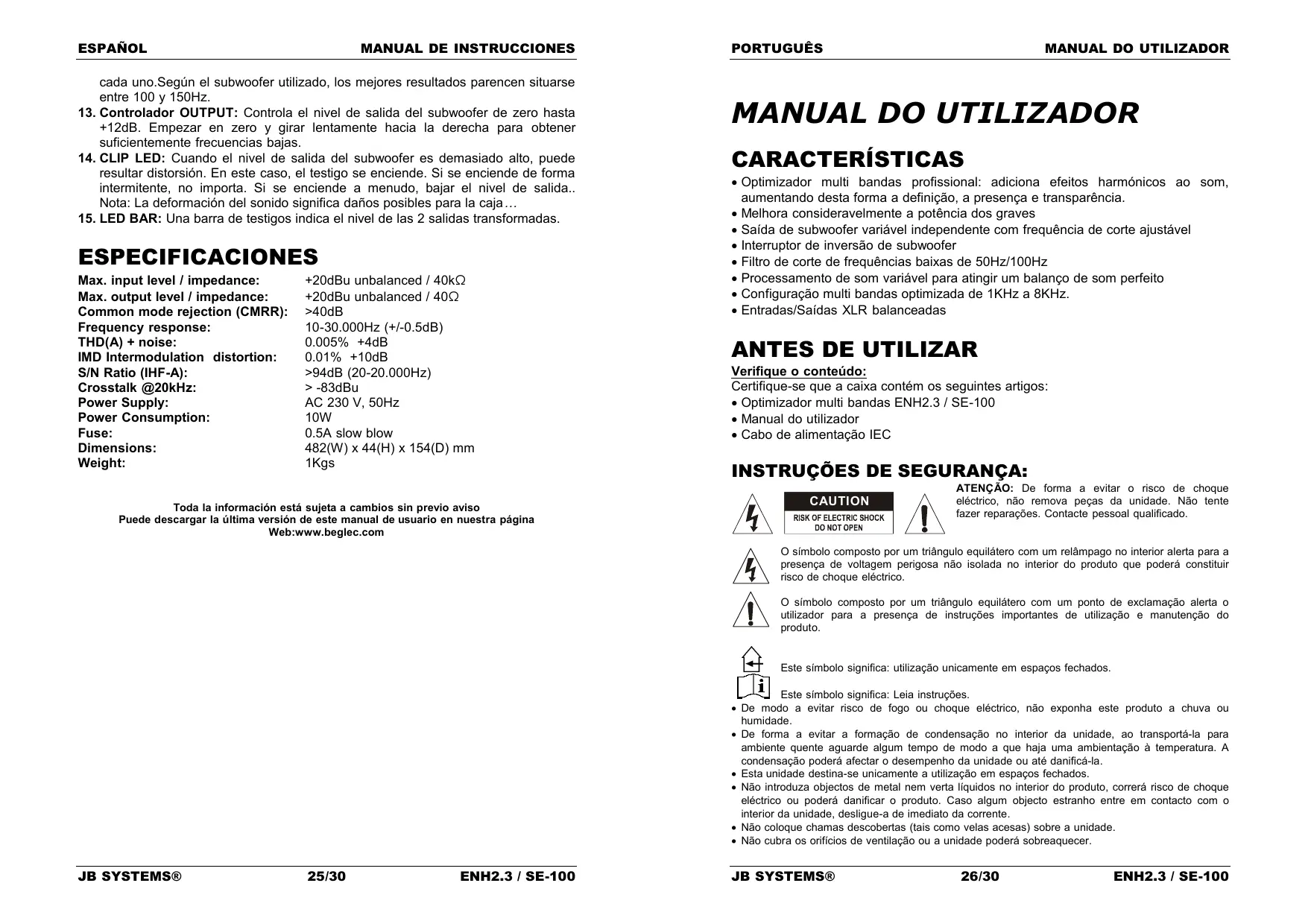 as saídas do optimizador. ESPECIFICAÇÕES Nível máx. entrada / impedância: Nível máx. saída / impedância: Common mode rejection (CMRR): Resposta em Frequência: THD(A) + ruído: Distorção de modulação (IMD): S/N Ratio (IHF-A): Crosstalk @20kHz: Fonte de Alimentação: Consumo de energia: Fusível: Dimensões: Peso: +20dBu sem balanço / 40kΩ +20dBu sem balanço / 40Ω >40dB 10-30.000Hz (+/-0.5dB) 0.005% +4dB 0.01% +10dB >94dB (20-20.000Hz) > -83dBu AC 230 V, 50Hz 10W 0.5A fusão lenta 482(W) x 44(H) x 154(D) mm 1Kgs Estas informações estão sujeitas a alterações sem aviso prévio Pode fazer download da versão mais recente deste manual no nosso site: www.beglec.com JB SYSTEMS® 30/30 ENH2.3 / SE-100