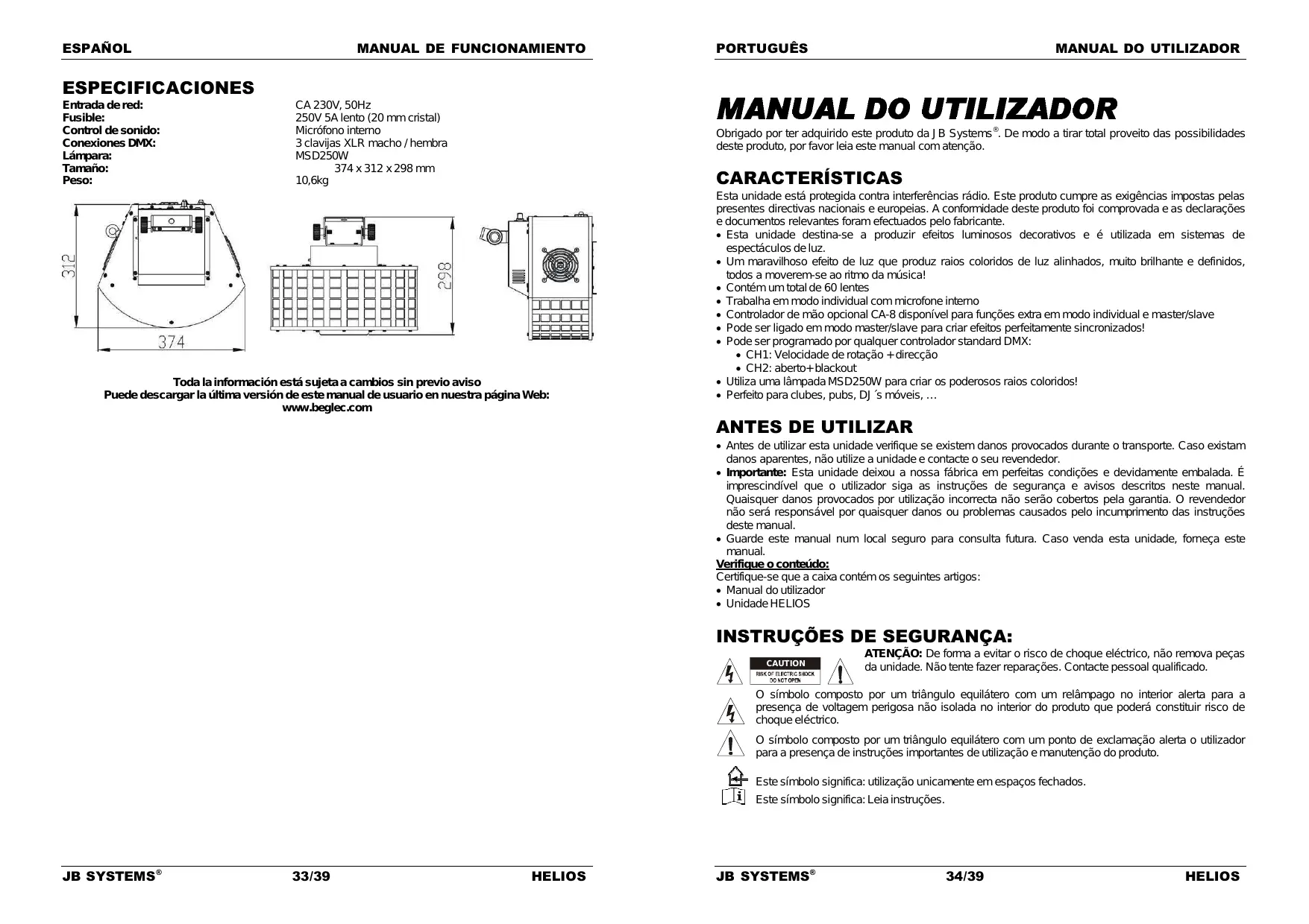 Obrigado por ter adquirido este produto da JB Systems . De modo a tirar total proveito das possibilidades deste produto, por favor leia este manual com atenção. CARACTERÍSTICAS Toda la información está sujeta a cambios sin previo aviso Puede descargar la última versión de este manual de usuario en nuestra página Web: www.beglec.com Esta unidade está protegida contra interferências rádio. Este produto cumpre as exigências impostas pelas presentes directivas nacionais e europeias. A conformidade deste produto foi comprovada e as declarações e documentos relevantes foram efectuados pelo fabricante. Esta unidade destina-se a produzir efeitos luminosos decorativos e é utilizada em sistemas de espectáculos de luz. Um maravilhoso efeito de luz que produz raios coloridos de luz alinhados, muito brilhante e definidos, todos a moverem-se ao ritmo da música! Contém um total de 60 lentes Trabalha em modo individual com microfone interno Controlador de mão opcional CA-8 disponível para funções extra em modo individual e master/slave Pode ser ligado em modo master/slave para criar efeitos perfeitamente sincronizados! Pode ser programado por qualquer controlador standard DMX: CH1: Velocidade de rotação + direcção CH2: aberto+ blackout Utiliza uma lâmpada MSD250W para criar os poderosos raios coloridos! Perfeito para clubes, pubs, DJ´s móveis, …