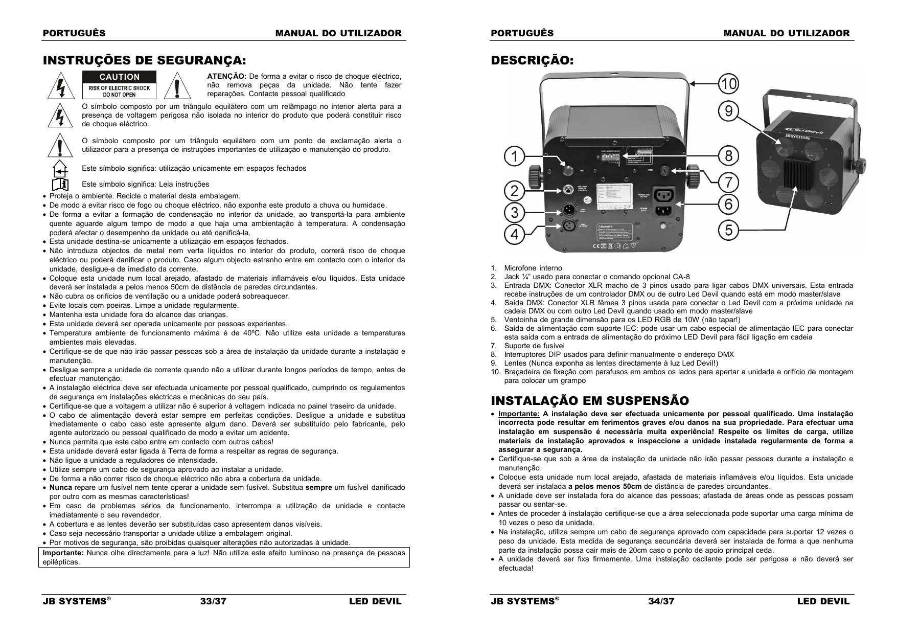 DESCRIÇÃO: ATENÇÃO: De forma a evitar o risco de choque eléctrico, não remova peças da unidade. Não tente fazer reparações. Contacte pessoal qualificado O símbolo composto por um triângulo equilátero com um relâmpago no interior alerta para a presença de voltagem perigosa não isolada no interior do produto que poderá constituir risco de choque eléctrico. O símbolo composto por um triângulo equilátero com um ponto de exclamação alerta o utilizador para a presença de instruções importantes de utilização e manutenção do produto. Este símbolo significa: utilização unicamente em espaços fechados Este símbolo significa: Leia instruções Proteja o ambiente. Recicle o material desta embalagem. De modo a evitar risco de fogo ou choque eléctrico, não exponha este produto a chuva ou humidade. De forma a evitar a formação de condensação no interior da unidade, ao transportá-la para ambiente quente aguarde algum tempo de modo a que haja uma ambientação à temperatura. A condensação poderá afectar o desempenho da unidade ou até danificá-la. Esta unidade destina-se unicamente a utilização em espaços fechados. Não introduza objectos de metal nem verta líquidos no interior do produto, correrá risco de choque eléctrico ou poderá danificar o produto. Caso algum objecto estranho entre em contacto com o interior da unidade, desligue-a de imediato da corrente. Coloque esta unidade num local arejado, afastado de materiais inflamáveis e/ou líquidos. Esta unidade deverá ser instalada a pelos menos 50cm de distância de paredes circundantes. Não cubra os orifícios de ventilação ou a unidade poderá sobreaquecer. Evite locais com poeiras. Limpe a unidade regularmente. Mantenha esta unidade fora do alcance das crianças. Esta unidade deverá ser operada unicamente por pessoas experientes. Temperatura ambiente de funcionamento máxima é de 40ºC. Não utilize esta unidade a temperaturas ambientes mais elevadas. Certifique-se de que não irão passar pessoas sob a área de instalação da unidade durante a instalação e manutenção. Desligue sempre a unidade da corrente quando não a utilizar durante longos períodos de tempo, antes de efectuar manutenção. A instalação eléctrica deve ser efectuada unicamente por pessoal qualificado, cumprindo os regulamentos de segurança em instalações eléctricas e mecânicas do seu país. Certifique-se que a voltagem a utilizar não é superior à voltagem indicada no painel traseiro da unidade. O cabo de alimentação deverá estar sempre em perfeitas condições. Desligue a unidade e substitua imediatamente o cabo caso este apresente algum dano. Deverá ser substituído pelo fabricante, pelo agente autorizado ou pessoal qualificado de modo a evitar um acidente. Nunca permita que este cabo entre em contacto com outros cabos! Esta unidade deverá estar ligada à Terra de forma a respeitar as regras de segurança. Não ligue a unidade a reguladores de intensidade. Utilize sempre um cabo de segurança aprovado ao instalar a unidade. De forma a não correr risco de choque eléctrico não abra a cobertura da unidade. Nunca repare um fusível nem tente operar a unidade sem fusível. Substitua sempre um fusível danificado por outro com as mesmas características! Em caso de problemas sérios de funcionamento, interrompa a utilização da unidade e contacte imediatamente o seu revendedor. A cobertura e as lentes deverão ser substituídas caso apresentem danos visíveis. Caso seja necessário transportar a unidade utilize a embalagem original. Por motivos de segurança, são proibidas quaisquer alterações não autorizadas à unidade. Importante: Nunca olhe directamente para a luz! Não utilize este efeito luminoso na presença de pessoas epilépticas. JB SYSTEMS® 33/37 LED DEVIL