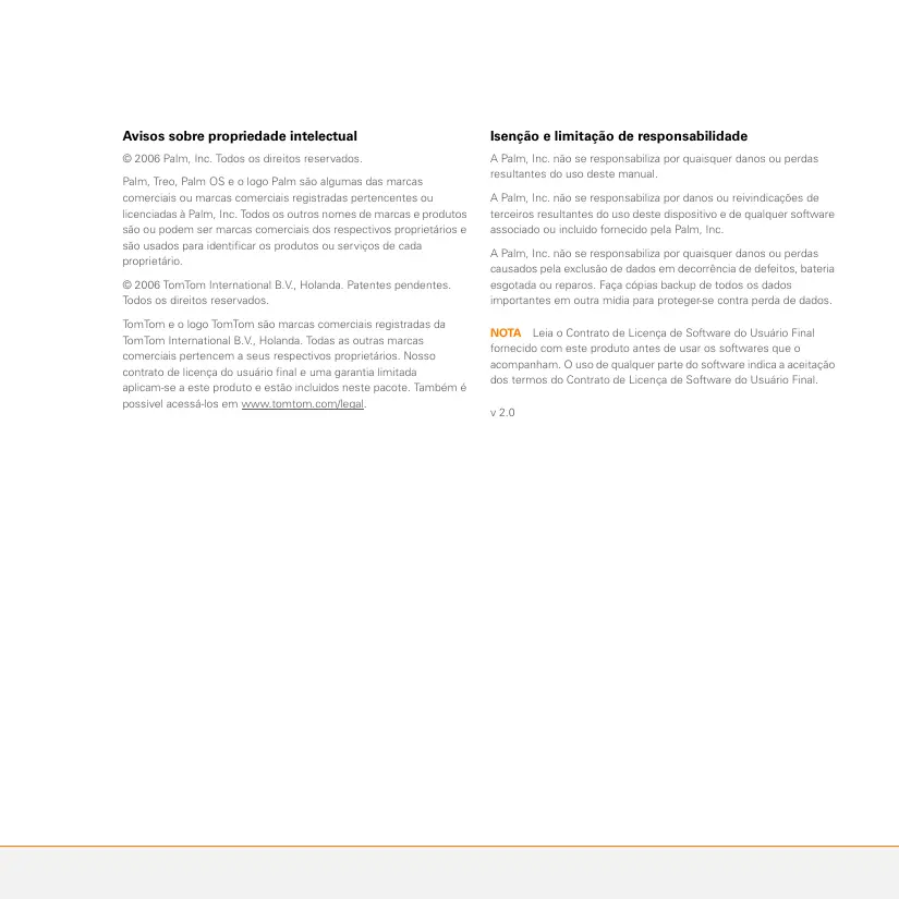 Avisos sobre propriedade intelectual Isenção e limitação de responsabilidade © 2006 Palm, Inc. Todos os direitos reservados. A Palm, Inc. não se responsabiliza por quaisquer danos ou perdas resultantes do uso deste manual. Palm, Treo, Palm OS e o logo Palm são algumas das marcas comerciais ou marcas comerciais registradas pertencentes ou licenciadas à Palm, Inc. Todos os outros nomes de marcas e produtos são ou podem ser marcas comerciais dos respectivos proprietários e são usados para identificar os produtos ou serviços de cada proprietário. © 2006 TomTom International B.V., Holanda. Patentes pendentes. Todos os direitos reservados. TomTom e o logo TomTom são marcas comerciais registradas da TomTom International B.V., Holanda. Todas as outras marcas comerciais pertencem a seus respectivos proprietários. Nosso contrato de licença do usuário final e uma garantia limitada aplicam-se a este produto e estão incluídos neste pacote. Também é possível acessá-los em www.tomtom.com/legal. A Palm, Inc. não se responsabiliza por danos ou reivindicações de terceiros resultantes do uso deste dispositivo e de qualquer software associado ou incluído fornecido pela Palm, Inc. A Palm, Inc. não se responsabiliza por quaisquer danos ou perdas causados pela exclusão de dados em decorrência de defeitos, bateria esgotada ou reparos. Faça cópias backup de todos os dados importantes em outra mídia para proteger-se contra perda de dados. NOTA Leia o Contrato de Licença de Software do Usuário Final fornecido com este produto antes de usar os softwares que o acompanham. O uso de qualquer parte do software indica a aceitação dos termos do Contrato de Licença de Software do Usuário Final. v 2.0 Introdução O Navegador GPS da Palm® fornece mapas detalhados, planejamento de rota e navegação por voz. O Navegador GPS usa o software TomTom NAVIGATOR e os mapas no dispositivo. Para usar o Navegador, o dispositivo estabelece uma conexão sem fio com o receptor GPS incluído usando a tecnologia sem fio Bluetooth . O receptor transmite as informações para o software NAVIGATOR exibido na tela do dispositivo. Este manual explica como configurar o software TomTom NAVIGATOR no dispositivo. Algumas das etapas de configuração do software NAVIGATOR serão diferentes se o dispositivo for executado no software Palm OS ou Windows Mobile . Dispositivos compatíveis com Palm OS