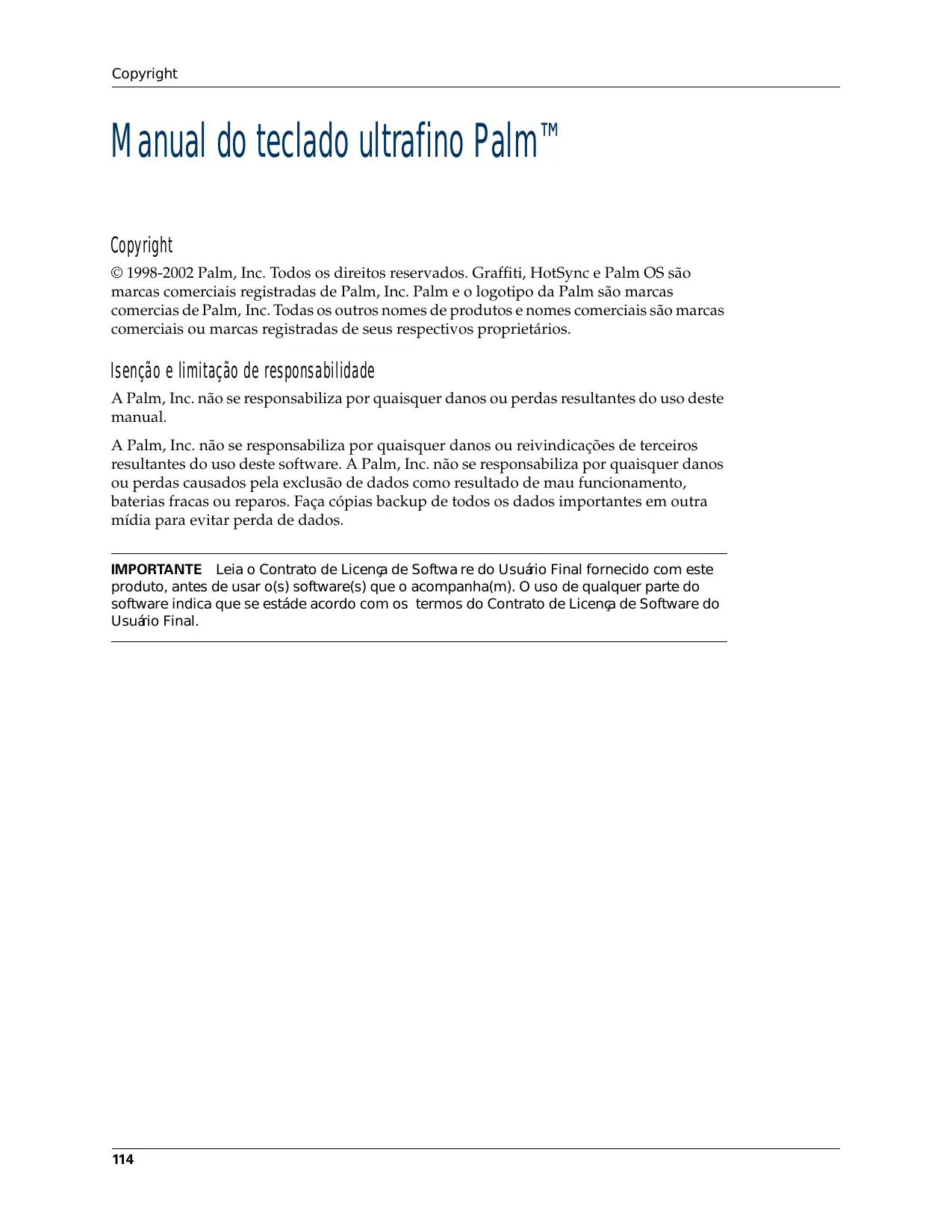 Copyright Manual do teclado ultrafino Palm™ Copyright © 1998-2002 Palm, Inc. Todos os direitos reservados. Graffiti, HotSync e Palm OS são marcas comerciais registradas de Palm, Inc. Palm e o logotipo da Palm são marcas comercias de Palm, Inc. Todas os outros nomes de produtos e nomes comerciais são marcas comerciais ou marcas registradas de seus respectivos proprietários. Isenção e limitação de responsabilidade A Palm, Inc. não se responsabiliza por quaisquer danos ou perdas resultantes do uso deste manual. A Palm, Inc. não se responsabiliza por quaisquer danos ou reivindicações de terceiros resultantes do uso deste software. A Palm, Inc. não se responsabiliza por quaisquer danos ou perdas causados pela exclusão de dados como resultado de mau funcionamento, baterias fracas ou reparos. Faça cópias backup de todos os dados importantes em outra mídia para evitar perda de dados. IMPORTANTE Leia o Contrato de Licença de Softwa re do Usuário Final fornecido com este produto, antes de usar o(s) software(s) que o acompanha(m). O uso de qualquer parte do software indica que se está de acordo com os termos do Contrato de Licença de Software do Usuário Final.