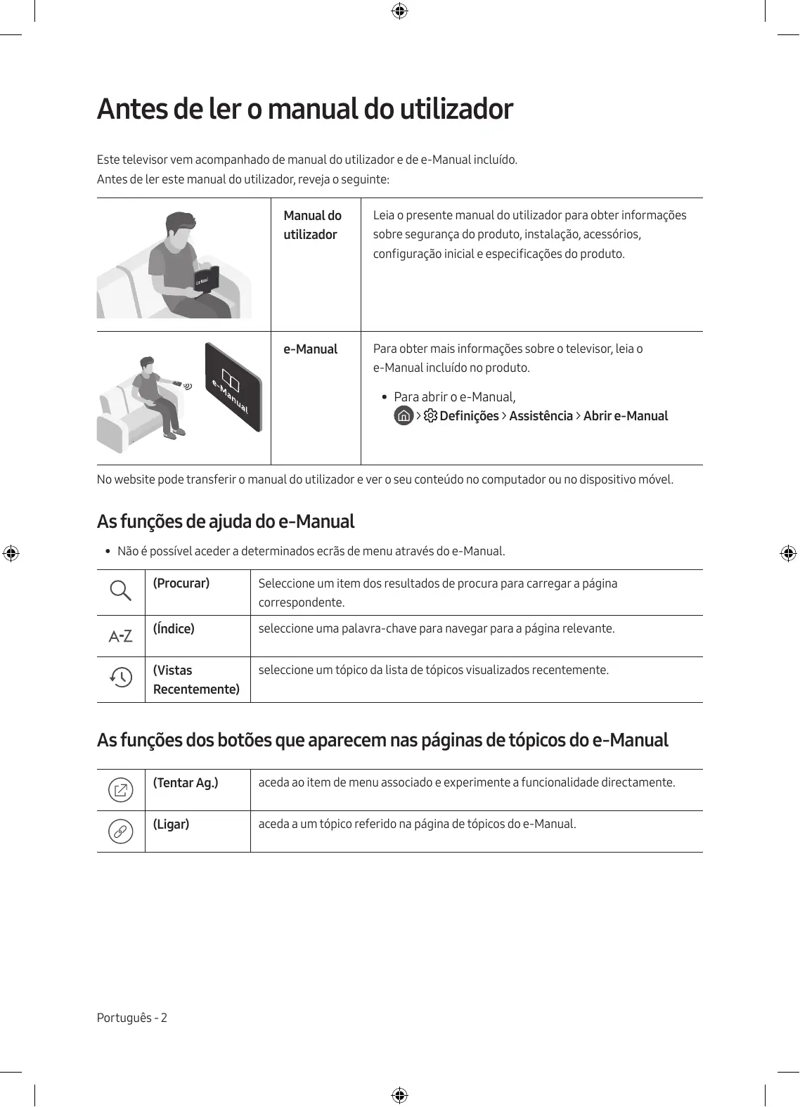- • Para abrir o e-Manual, > Definições > Assistência > Abrir e-Manual No website pode transferir o manual do utilizador e ver o seu conteúdo no computador ou no dispositivo móvel. As funções de ajuda do e-Manual