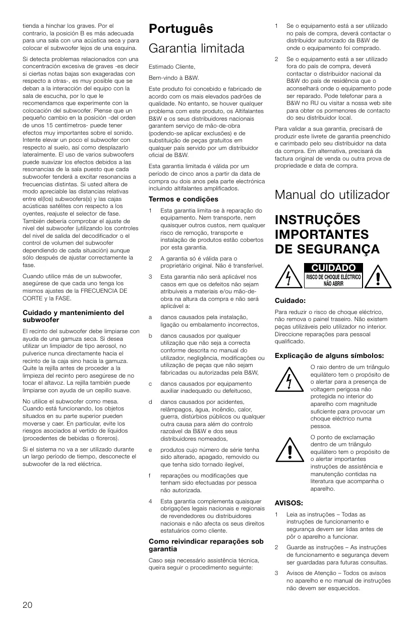 -6dB dentro do intervalo de ajuste do subwoofer. subwoofer), mas apenas após escolher a posição correcta do comutador de fase. Italiano Se as colunas satélite estão a ser alimentadas através do filtro passa-alto do subwoofer, a frequência precisará de ser configurada mais baixa do que o valor inicial 80Hz se a frequência de -3dB das colunas satélite está acima de 80Hz e mais alta se abaixo. Quando usar mais do que um subwoofer, certifique-se que cada um tem a frequência do FILTRO PASSA-BAIXO e FASE definidas da mesma maneira. Garanzia limitata Cuidados com o subwoofer Un benvenuto da parte della B&W. A caixa do subwoofer pode ser limpa apenas com um pano seco. Se preferir utilizar um produto de polimento em spray, deverá pulverizar sobre o pano e depois aplicar (nunca pulverizar directamente sobre o equipamento). Remova cuidadosamente a grelha afastando-a da caixa e limpe-a com uma escova macia. Questo prodotto è stato progettato e fabbricato secondo i più alti standard qualitativi. Tuttavia, nell’improbabile caso di un guasto o malfunzionamento, B&W Loudspeakers e i suoi distributori nazionali garantiscono parti sostitutive e mano d’opera gratuite (alcune eccezioni sono possibili) nei paesi in cui è presente un distributore ufficiale B&W. Configure o sistema na posição preferida e faça audições de materiais com um grave firme. Usando o guia inicial de configuração, primeiro verifique a configuração do interruptor de FASE (PHASE). Escolha a posição que lhe dá o som mais completo. A posição normalmente recomendada será óptima, mas poderá não o ser em certas circunstâncias, tal como se está a usar ligações de linha e o amplificador de potência que está a alimentar as colunas satélite inverter o sinal, ou se os subwoofers não estão posicionados perto das colunas satélite. Use uma grande variedade de material em audição para conseguir uma configuração média. O que lhe pode soar impressionante numa audição poderá soar sobrealimentado noutra. Ouça a níveis realistas visto que a percepção de equilíbrio varia com os níveis de som. Finalmente, ajuste a frequência do FILTRO PASSA-BAIXO para dar uma transição mais suave entre o subwoofer e as colunas satélite. Isto é provavelmente o mais difícil de optimizar. Não utilize o subwoofer como mesa. Os objectos colocados sobre ele chocalham e deterioram a qualidade de som. Os líquidos são particularmente perigosos (por exemplo bebidas ou vasos de flores), deve pois conservá-los o mais afastados possível do equipamento. Egregio cliente Questa garanzia limitata è valida per un periodo di cinque anni dalla data di acquisto o di due anni per i componenti elettronici, altoparlanti inclusi. Termini e condizioni