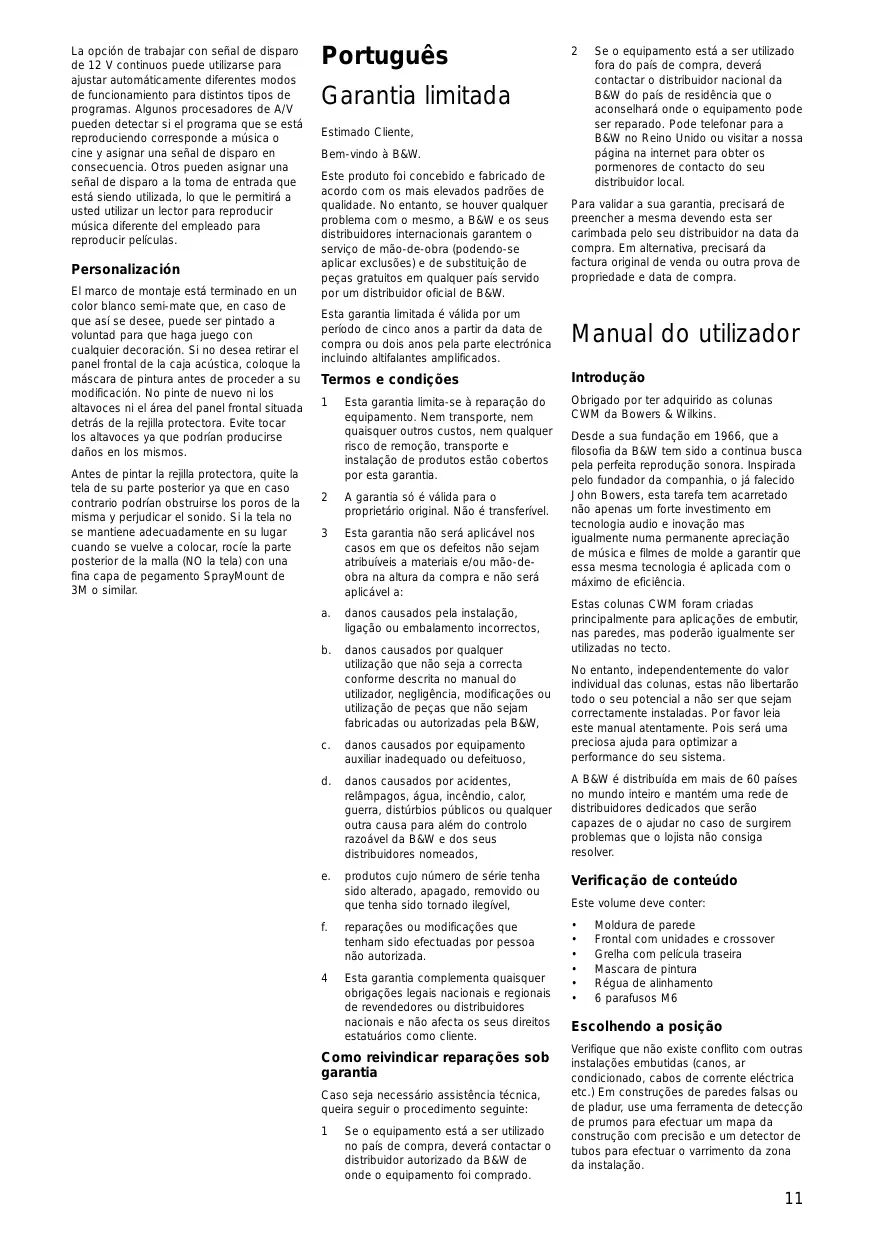 Garantia limitada Estimado Cliente, Bem-vindo à B&W. Este produto foi concebido e fabricado de acordo com os mais elevados padrões de qualidade. No entanto, se houver qualquer problema com o mesmo, a B&W e os seus distribuidores internacionais garantem o serviço de mão-de-obra (podendo-se aplicar exclusões) e de substituição de peças gratuitos em qualquer país servido por um distribuidor oficial de B&W.