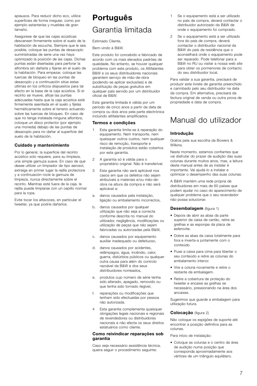 Garantia limitada Estimado Cliente, Bem-vindo à B&W. Este produto foi concebido e fabricado de acordo com os mais elevados padrões de qualidade. No entanto, se houver qualquer problema com este produto, os Altifalantes B&W e os seus distribuidores nacionais garantem serviço de mão-de-obra (podendo-se aplicar exclusões) e de substituição de peças gratuitos em qualquer país servido por um distribuidor oficial de B&W. Esta garantia limitada é válida por um período de cinco anos a partir da data de compra ou dois anos pela parte electrónica incluindo altifalantes amplificados.