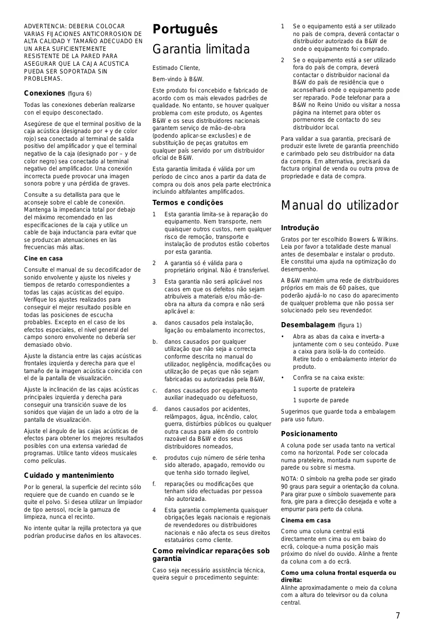 Gratos por ter escolhido Bowers & Wilkins. Leia por favor a totalidade deste manual antes de desembalar e instalar o produto. Ele constitui uma ajuda na optimização do desempenho.