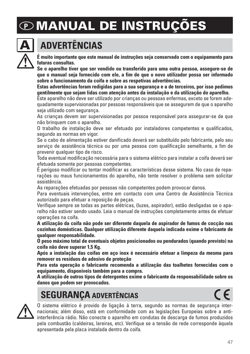 ADVERTÊNCIAS É muito importante que este manual de instruções seja conservado com o equipamento para futuras consultas. Se o aparelho tiver que ser vendido ou transferido para uma outra pessoa, assegure-se de que o manual seja fornecido com ele, a fim de que o novo utilizador possa ser informado sobre o funcionamento da coifa e sobre as respetivas advertências. Estas advertências foram redigidas para a sua segurança e a de terceiros, por isso pedimos gentilmente que sejam lidas com atenção antes da instalação e da utilização do aparelho. Este aparelho não deve ser utilizado por crianças ou pessoas enfermas, exceto se forem adequadamente supervisionadas por pessoas responsáveis que se assegurem de que o aparelho seja utilizado com segurança. As crianças devem ser supervisionadas por pessoa responsável para assegurar-se de que não brinquem com o aparelho. O trabalho de instalação deve ser efetuado por instaladores competentes e qualificados, segundo as normas em vigor. Se o cabo de alimentação estiver danificado deverá ser substituído pelo fabricante, pelo seu serviço de assistência técnica ou por uma pessoa com qualificação semelhante, a fim de prevenir qualquer tipo de risco. Toda eventual modificação necessária para o sistema elétrico para instalar a coifa deverá ser efetuada somente por pessoas competentes. É perigoso modificar ou tentar modificar as características desse sistema. No caso de reparações ou maus funcionamentos do aparelho, não tente resolver o problema sem solicitar assistência. As reparações efetuadas por pessoas não competentes podem provocar danos. Para eventuais intervenções, entre em contacto com uma Centro de Assistência Técnica autorizado para efetuar a reposição de peças. Verifique sempre se todas as partes elétricas, (luzes, aspirador), estão desligadas se o aparelho não estiver sendo usado. Leia o manual de instruções completamente antes de efetuar operações na coifa. A utilização da coifa não pode ser diferente daquela de aspirador de fumos de cocção nas cozinhas domésticas. Qualquer utilização diferente daquela indicada exime o fabricante de qualquer responsabilidade. O peso máximo total de eventuais objetos posicionados ou pendurados (quando previsto) na coifa não deve superar 1,5 Kg. Após a instalação das coifas em aço inox é necessário efetuar a limpeza da mesma para remover os resíduos de adesivo de proteção Para esta operação o fabricante recomenda a utilização das toalhetes fornecidas com o equipamento, disponíveis também para a compra. A utilização de outros tipos de detergentes exime o fabricante da responsabilidade sobre os danos que podem ser provocados.