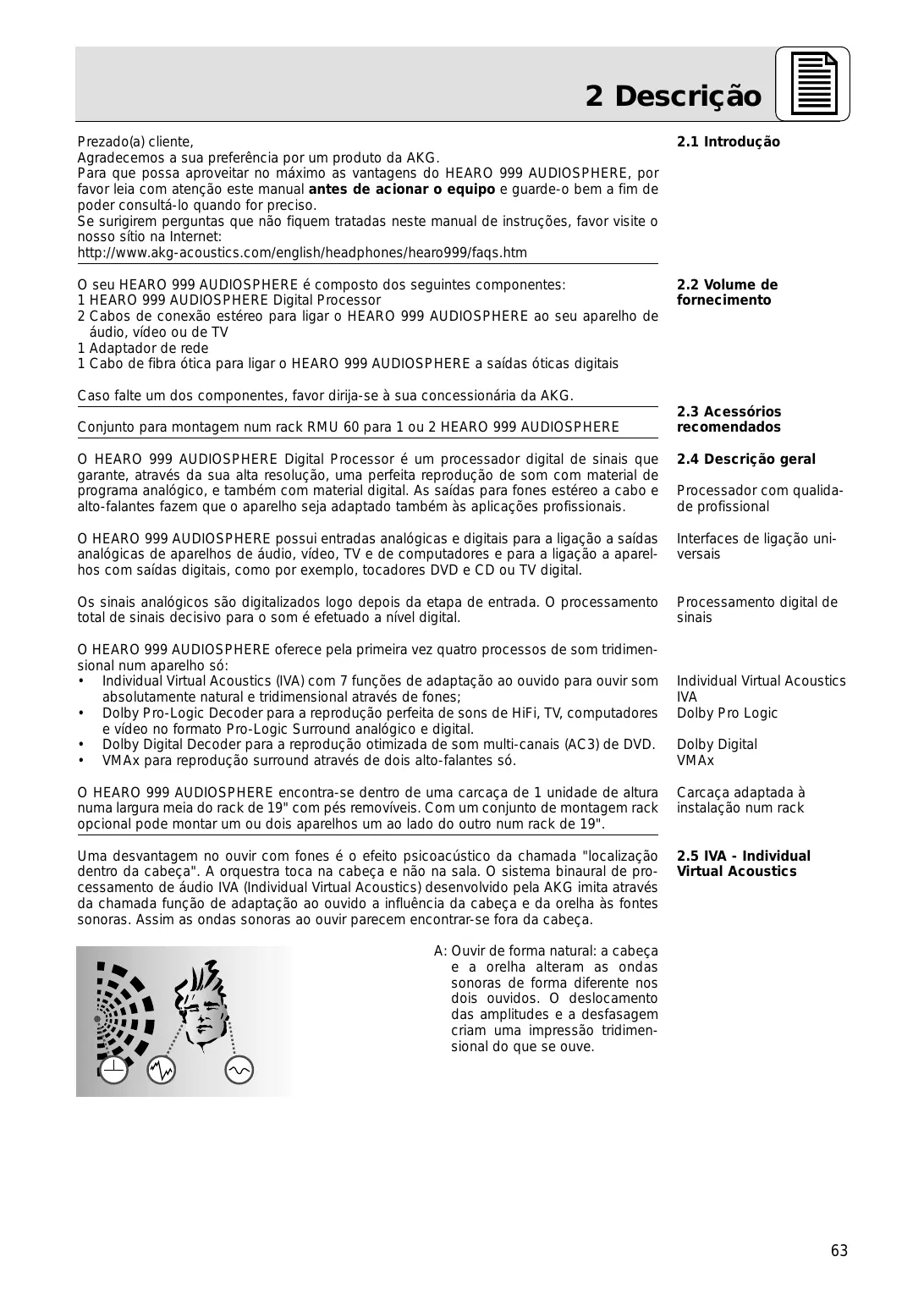 - VMAx para reprodução surround através de dois alto-falantes só. Processador com qualidade profissional Individual Virtual Acoustics IVA Dolby Pro Logic Dolby Digital VMAx O HEARO 999 AUDIOSPHERE encontra-se dentro de uma carcaça de 1 unidade de altura numa largura meia do rack de 19" com pés removíveis. Com um conjunto de montagem rack opcional pode montar um ou dois aparelhos um ao lado do outro num rack de 19". Carcaça adaptada à instalação num rack Uma desvantagem no ouvir com fones é o efeito psicoacústico da chamada "localização dentro da cabeça". A orquestra toca na cabeça e não na sala. O sistema binaural de processamento de áudio IVA (Individual Virtual Acoustics) desenvolvido pela AKG imita através da chamada função de adaptação ao ouvido a influência da cabeça e da orelha às fontes sonoras. Assim as ondas sonoras ao ouvir parecem encontrar-se fora da cabeça.
