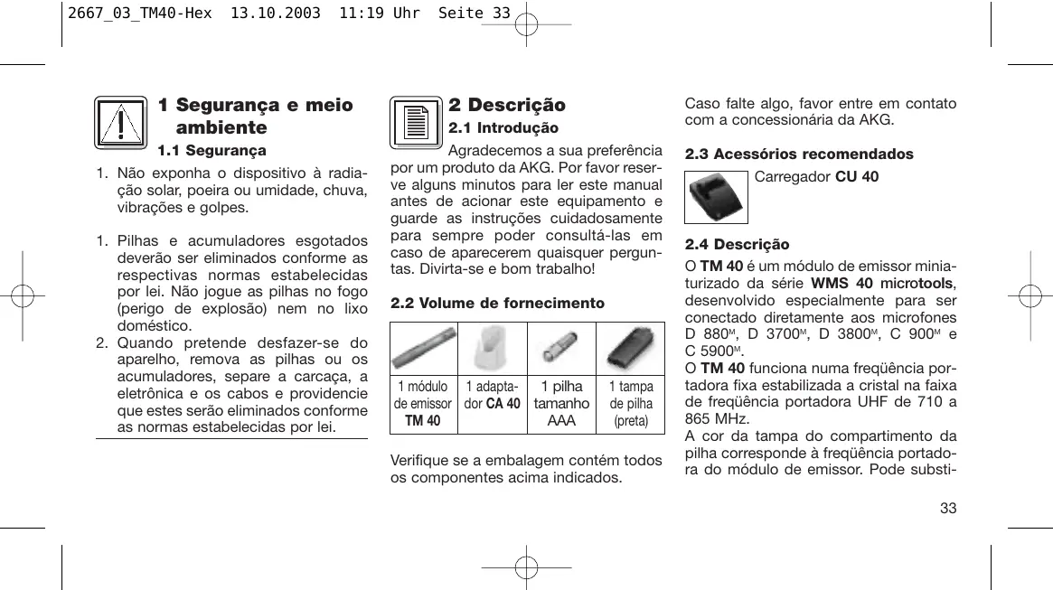 1 módulo 1 adapta- 1 pilha de emissor dor CA 40 tamanho TM 40 AAA 1 tampa de pilha (preta) Verifique se a embalagem contém todos os componentes acima indicados. Caso falte algo, favor entre em contato com a concessionária da AKG.