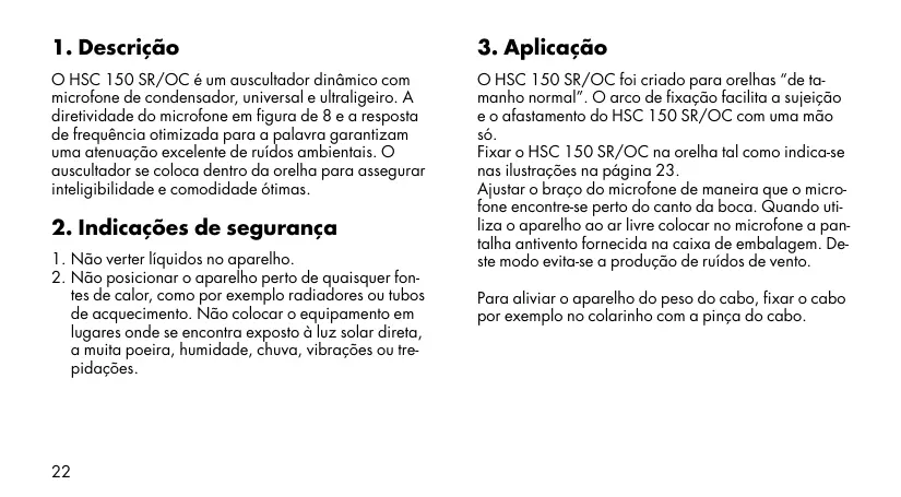 O HSC 150 SR/OC foi criado para orelhas “de tamanho normal”. O arco de fixação facilita a sujeição e o afastamento do HSC 150 SR/OC com uma mão só. Fixar o HSC 150 SR/OC na orelha tal como indica-se nas ilustrações na página 23. Ajustar o braço do microfone de maneira que o microfone encontre-se perto do canto da boca. Quando utiliza o aparelho ao ar livre colocar no microfone a pantalha antivento fornecida na caixa de embalagem. Deste modo evita-se a produção de ruídos de vento.