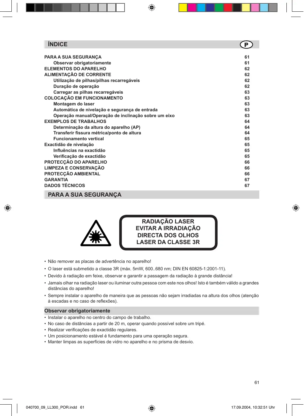 - O laser está submetido a classe 3R (máx. 5mW, 600..680 nm; DIN EN 60825-1:2001-11).
