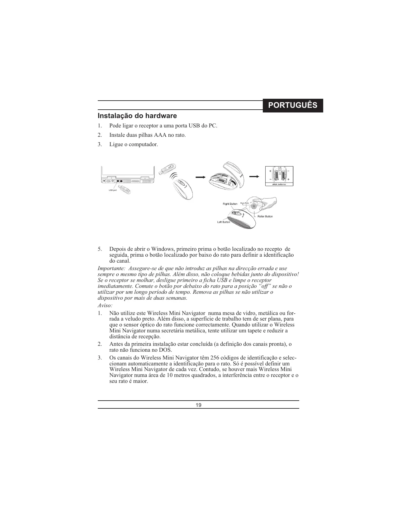 Depois de abrir o Windows, primeiro prima o botão localizado no recepto de seguida, prima o botão localizado por baixo do rato para definir a identificação do canal. Importante: Assegure-se de que não introduz as pilhas na direcção errada e use sempre o mesmo tipo de pilhas. Além disso, não coloque bebidas junto do dispositivo! Se o receptor se molhar, desligue primeiro a ficha USB e limpe o receptor imediatamente. Comute o botão por debaixo do rato para a posição “off” se não o utilizar por um longo período de tempo. Remova as pilhas se não utilizar o dispositivo por mais de duas semanas. Aviso: 1. Não utilize este Wireless Mini Navigator numa mesa de vidro, metálica ou forrada a veludo preto. Além disso, a superfície de trabalho tem de ser plana, para que o sensor óptico do rato funcione correctamente. Quando utilizar o Wireless Mini Navigator numa secretária metálica, tente utilizar um tapete e reduzir a distância de recepção.