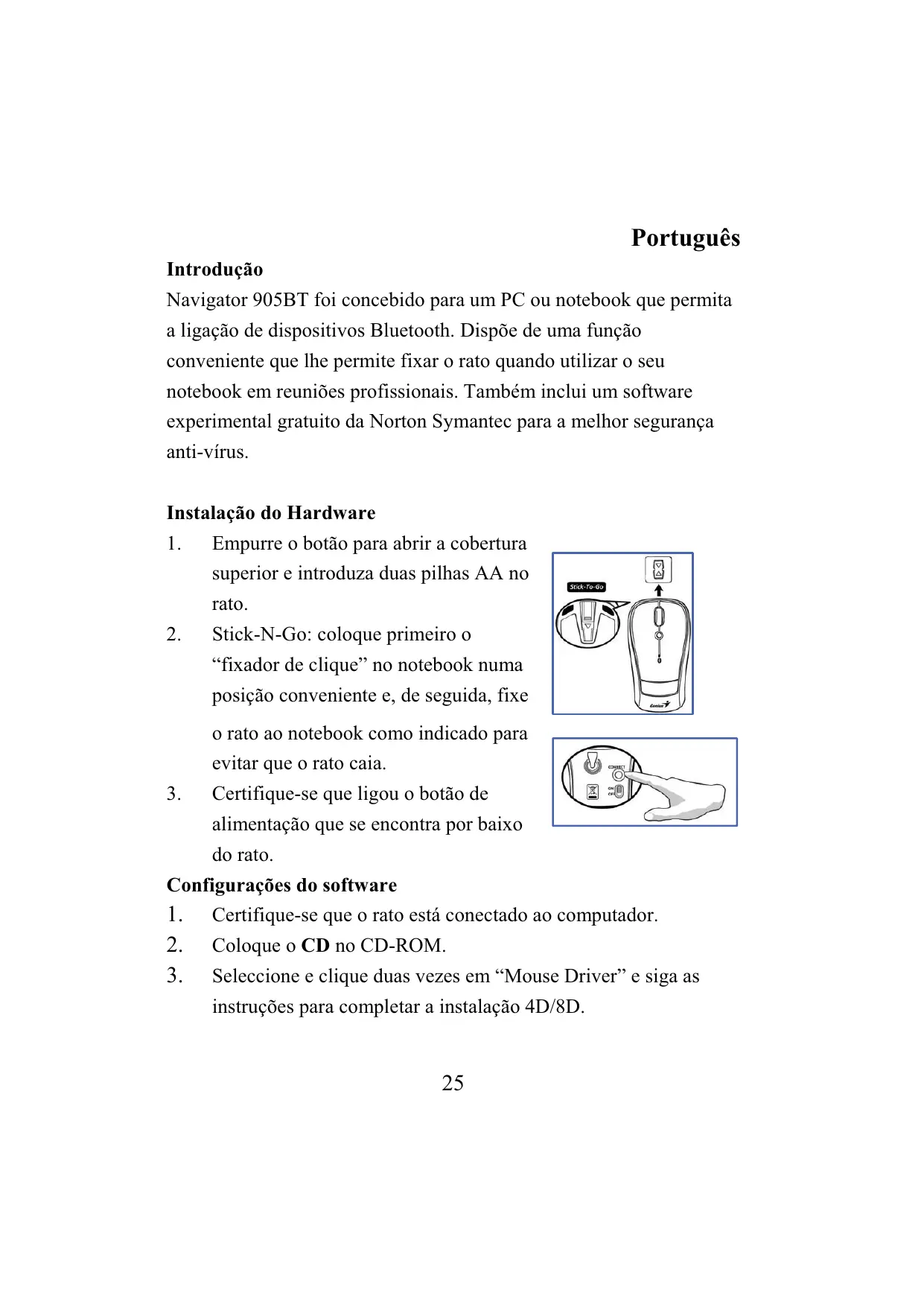 Português Introdução Navigator 905BT foi concebido para um PC ou notebook que permita a ligação de dispositivos Bluetooth. Dispõe de uma função conveniente que lhe permite fixar o rato quando utilizar o seu notebook em reuniões profissionais. Também inclui um software experimental gratuito da Norton Symantec para a melhor segurança anti-vírus. Instalação do Hardware