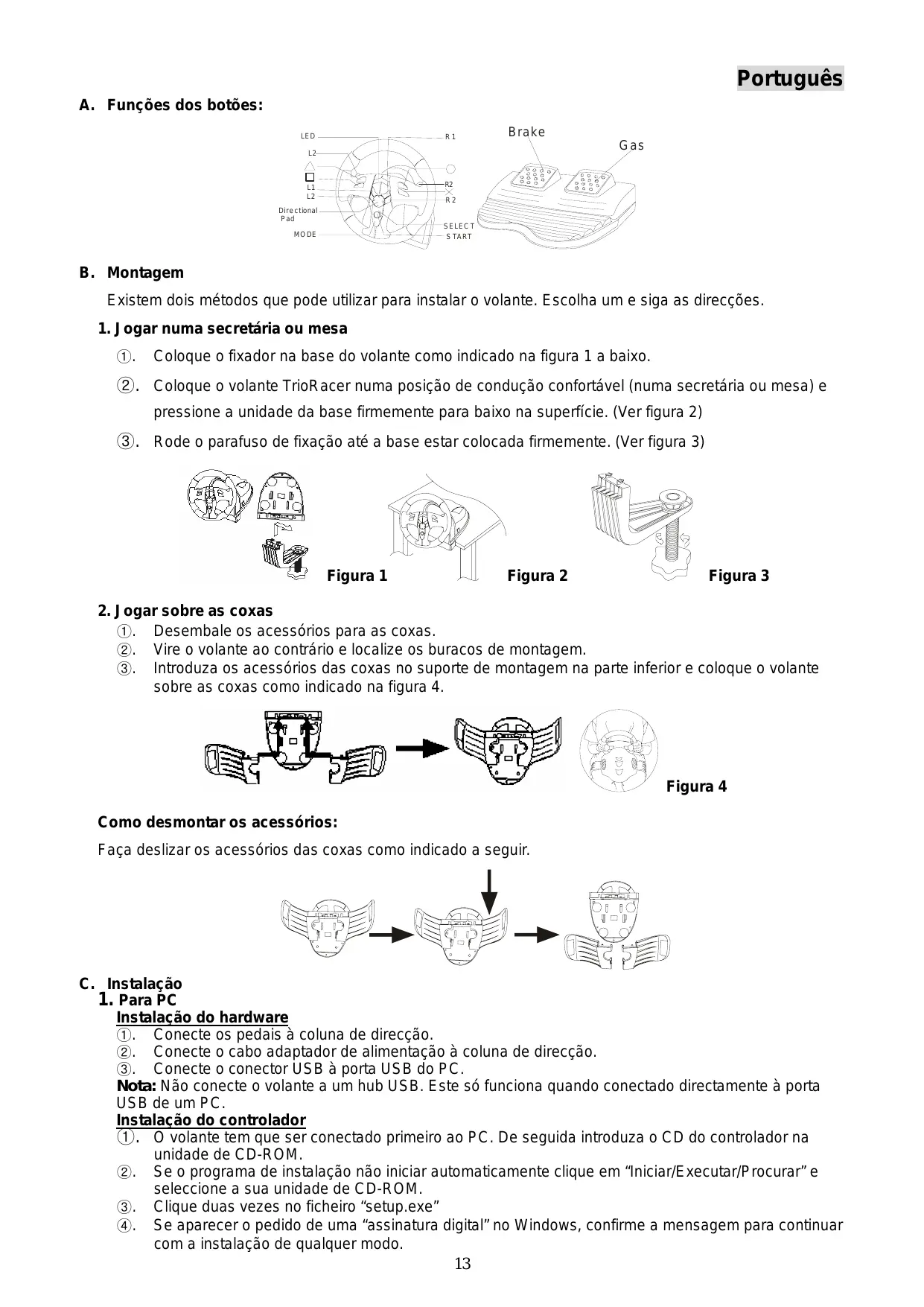 Instalação do hardware ①. Conecte os pedais à coluna de direcção. ②. Conecte o cabo adaptador de alimentação à coluna de direcção. ③. Conecte o conector USB à porta USB do PC. Nota: Não conecte o volante a um hub USB. Este só funciona quando conectado directamente à porta USB de um PC. Instalação do controlador ①. O volante tem que ser conectado primeiro ao PC. De seguida introduza o CD do controlador na unidade de CD-ROM. ②. Se o programa de instalação não iniciar automaticamente clique em “Iniciar/Executar/Procurar” e seleccione a sua unidade de CD-ROM. ③. Clique duas vezes no ficheiro “setup.exe” ④. Se aparecer o pedido de uma “assinatura digital” no Windows, confirme a mensagem para continuar com a instalação de qualquer modo.