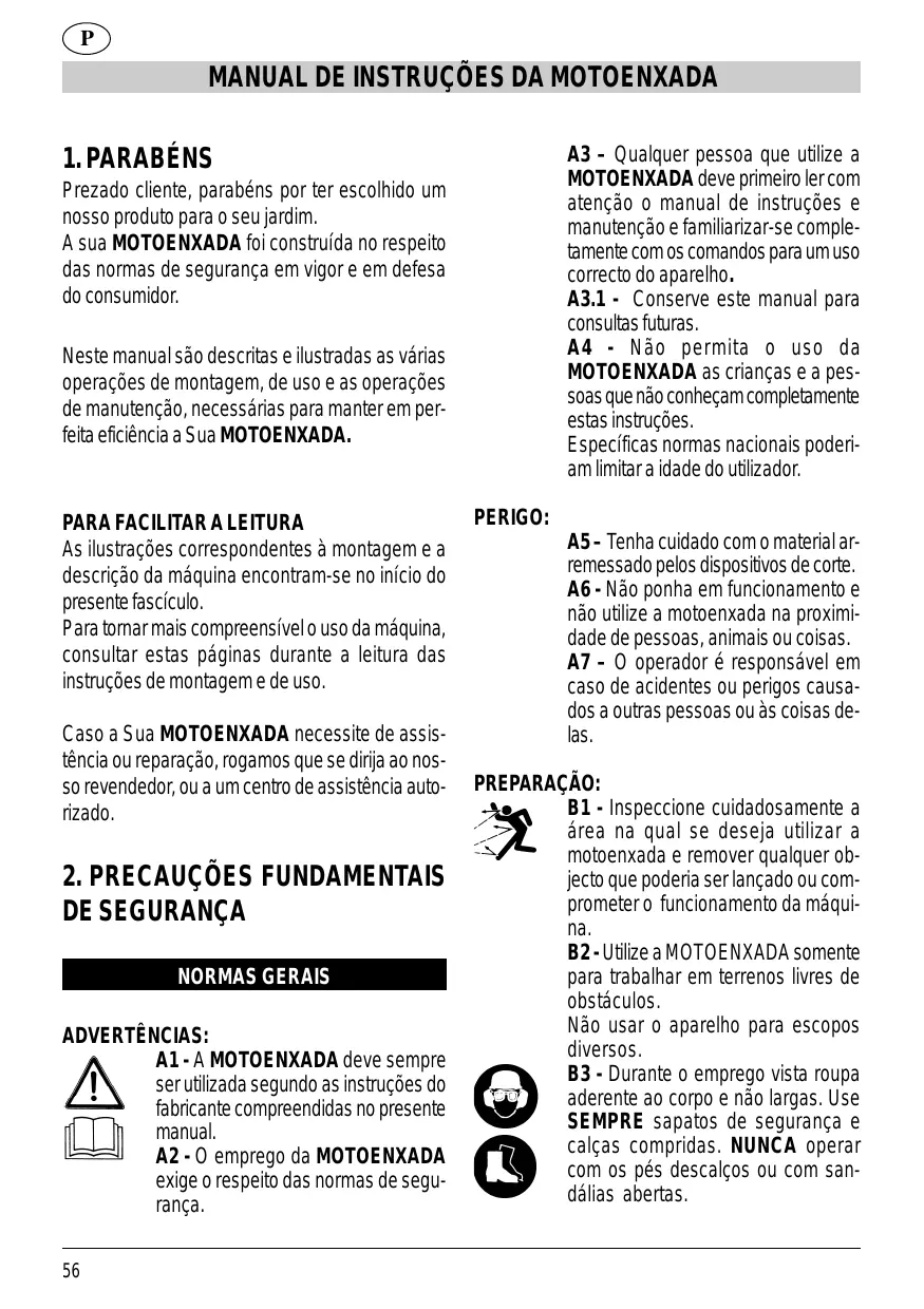 2. PRECAUÇÕES FUNDAMENTAIS DE SEGURANÇA NORMAS GERAIS ADVERTÊNCIAS: A1 - A MOTOENXADA deve sempre ser utilizada segundo as instruções do fabricante compreendidas no presente manual. A2 - O emprego da MOTOENXADA exige o respeito das normas de segurança. 56