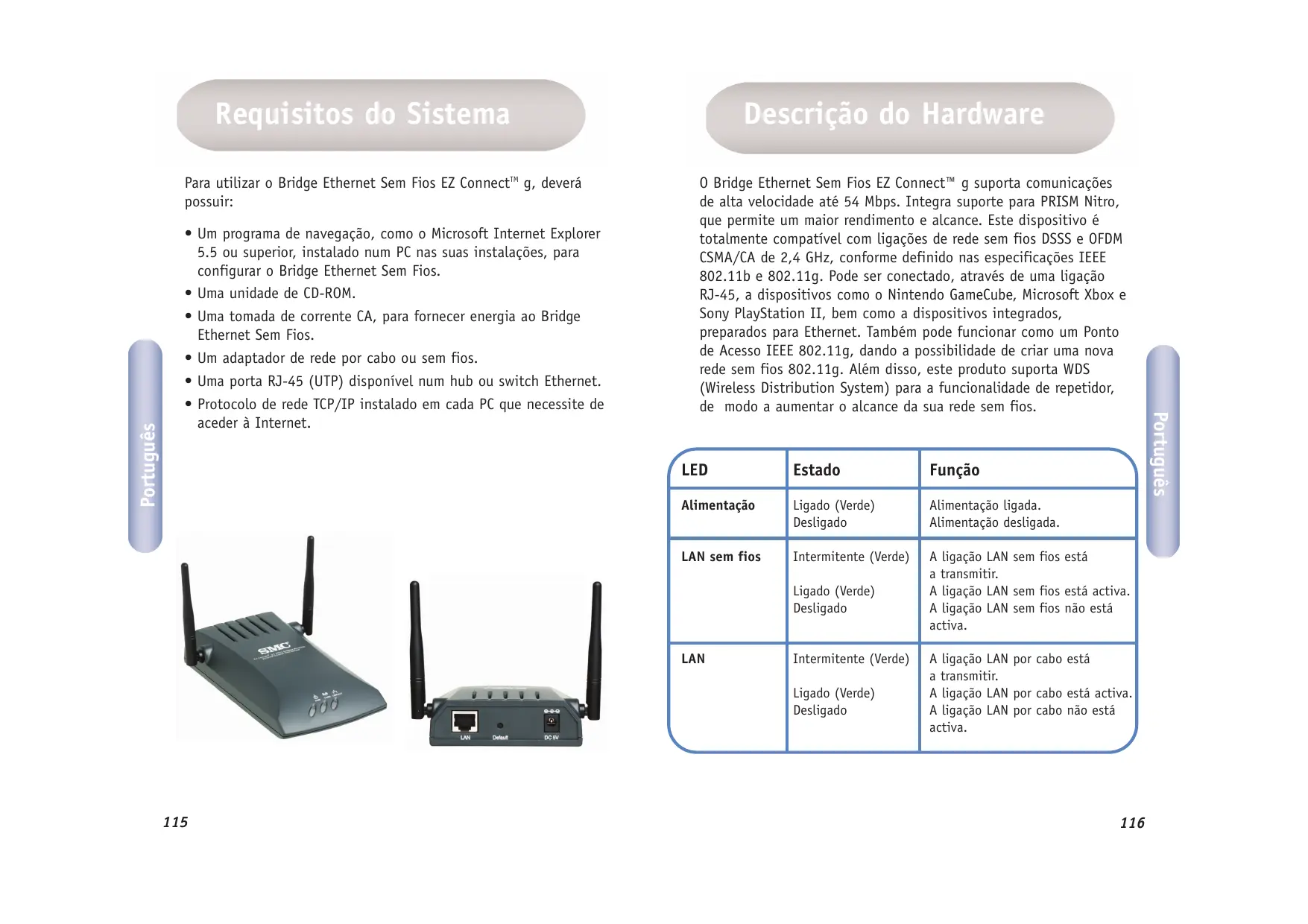 Português Português Para utilizar o Bridge Ethernet Sem Fios EZ ConnectTM g, deverá possuir: Descrição do Hardware Aplicações