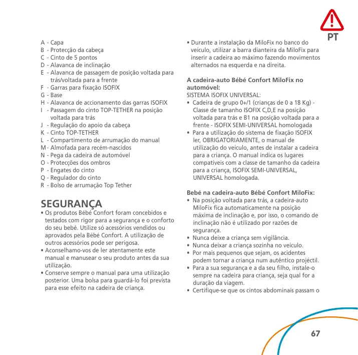 - Capa - Protecção da cabeça - Cinto de 5 pontos - Alavanca de inclinação - Alavanca de passagem de posição voltada para trás/voltada para a frente F - Garras para fixação ISOFIX G - Base H - Alavanca de accionamento das garras ISOFIX I - Passagem do cinto TOP-TETHER na posição voltada para trás J - Regulação do apoio da cabeça K - Cinto TOP-TETHER L - Compartimento de arrumação do manual M - Almofada para recém-nascidos N - Pega da cadeira de automóvel O - Protecções dos ombros P - Engates do cinto Q - Regulador do cinto R - Bolso de arrumação Top Tether