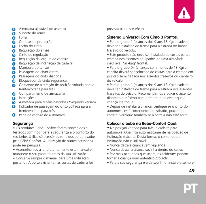 Bébé-Confort Opal no automóvel • Este dispositivo só é adequado para os automóveis aprovados e equipados com cintos 3 pontos/estáticos/ com retractor, homologados e conforme o regulamento CEE nº 16/ONU ou outra norma equivalente. • De costas para a estrada, este produto não deve ser instalado de costas para a estrada nos lugares equipados com Airbag frontal. Se puder desactivá-lo (ver manual fornecido com o seu carro), faço-o para utilizar a cadeira nesse lugar. • De frente para a estrada, a cadeira deve ser colocada no banco traseiro do automóvel ou excepcionalmente no da frente conforme a legislação em vigor no país de utilização • Este dispositivo de retenção de criança só é eficaz se forem respeitadas as instruções de utilização. • Prenda sempre o dispositivo de retenção mesmo se a criança não estiver lá. • O utilizador deve sempre verificar se a bagagem ou qualquer outro objecto susceptível de magoar a criança