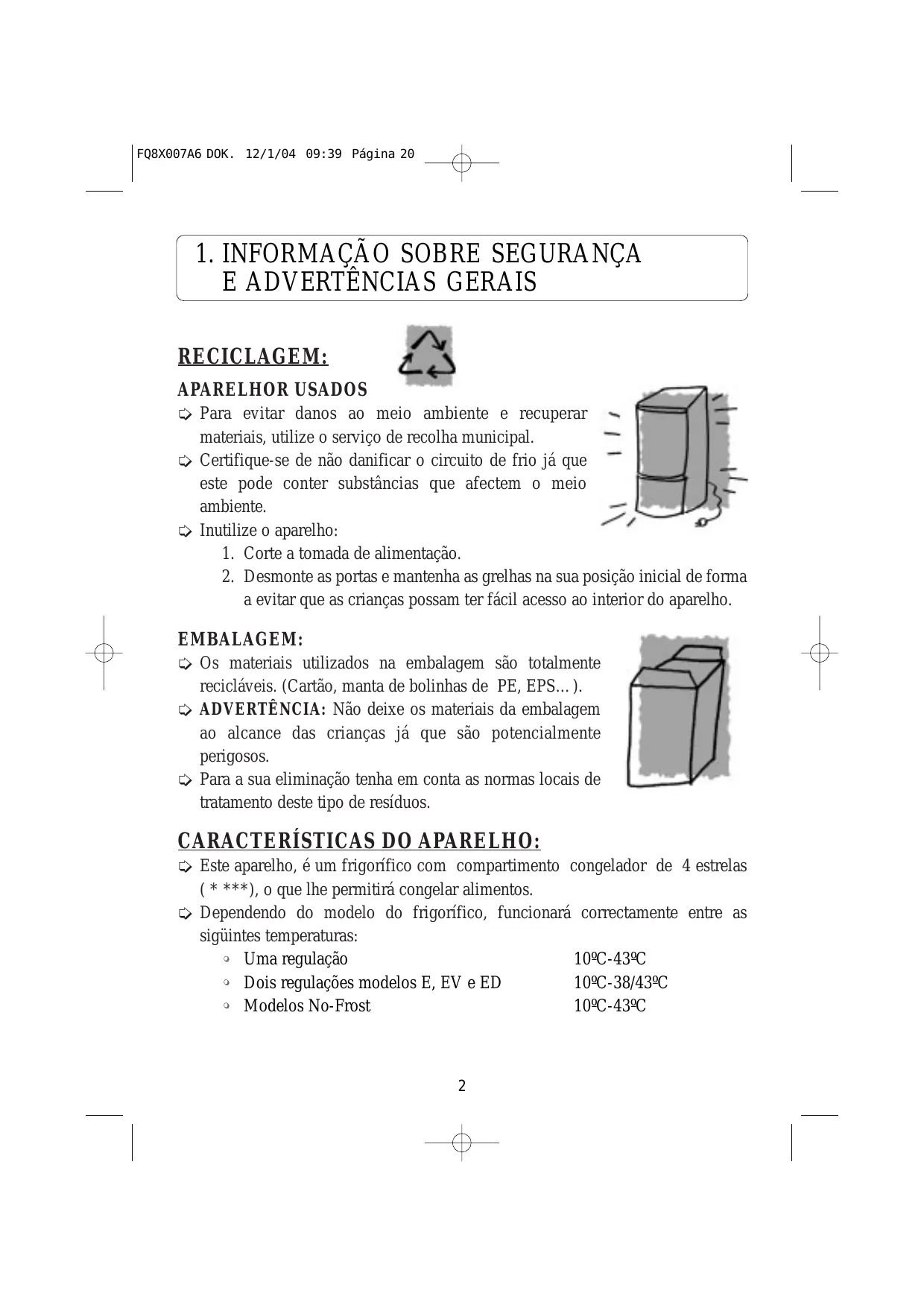 a evitar que as crianças possam ter fácil acesso ao interior do aparelho. EMBALAGEM: Os materiais utilizados na embalagem são totalmente recicláveis. (Cartão, manta de bolinhas de PE, EPS…). ADVERTÊNCIA: Não deixe os materiais da embalagem ao alcance das crianças já que são potencialmente perigosos. Para a sua eliminação tenha em conta as normas locais de tratamento deste tipo de resíduos. CARACTERÍSTICAS DO APARELHO: Este aparelho, é um frigorífico com compartimento congelador de 4 estrelas ( * ***), o que lhe permitirá congelar alimentos. Dependendo do modelo do frigorífico, funcionará correctamente entre as sigüintes temperaturas: