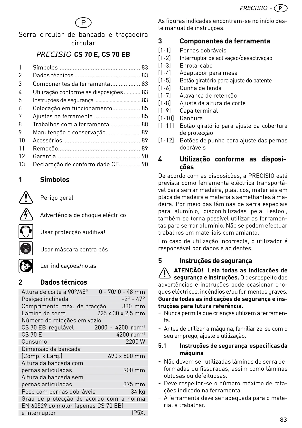 - Declaração de conformidade CE Símbolos Perigo geral Advertência de choque eléctrico Usar protecção auditiva! Usar máscara contra pós! Ler indicações/notas p. 90