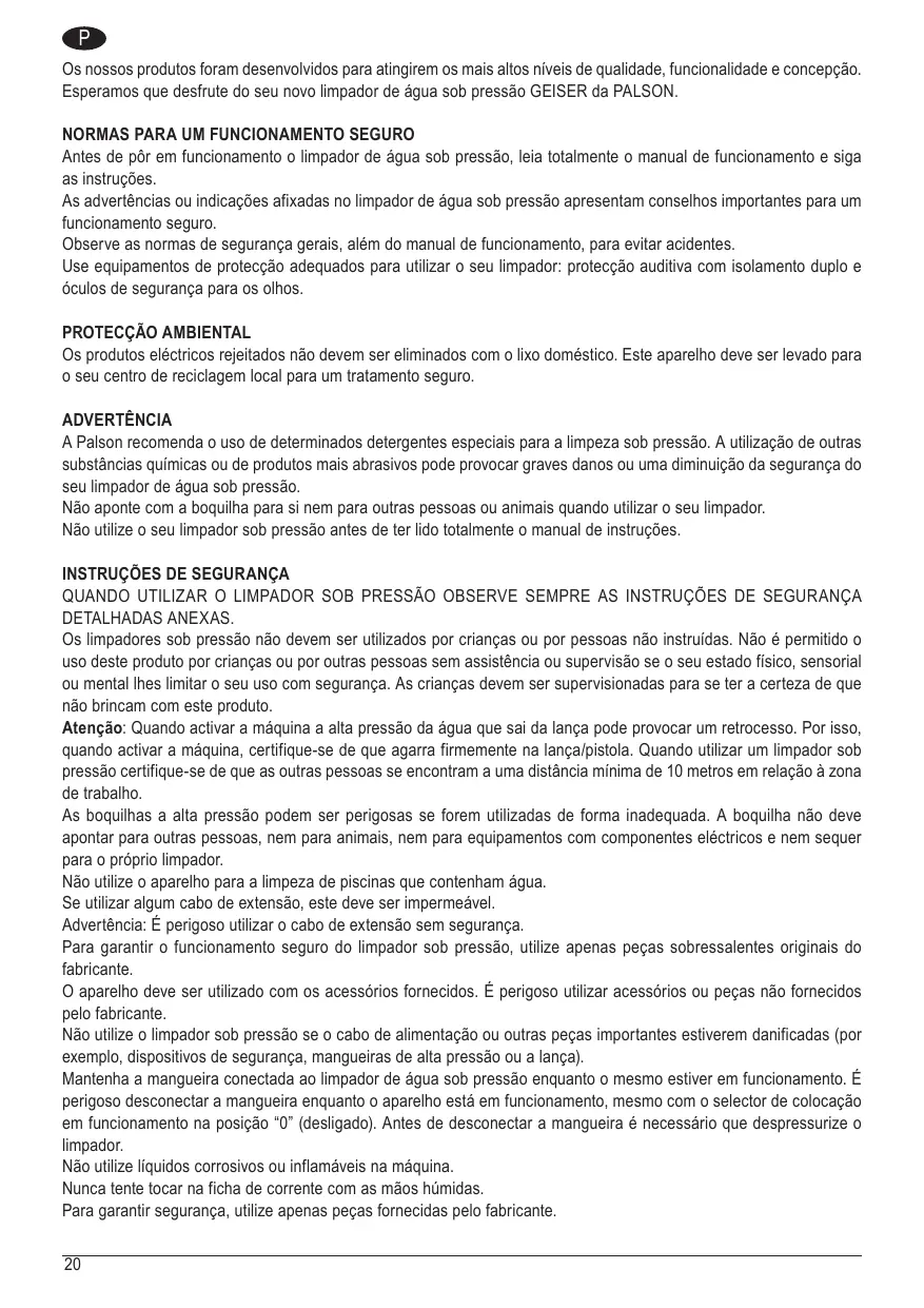 Os nossois produtos foram desenvolvimento para atingirem os mais altos niveis de qualidade, funcionalidade e concepcao. Esperamos que desfrute do seu novo limpador de agua sob pressao GEISER da PALSON.