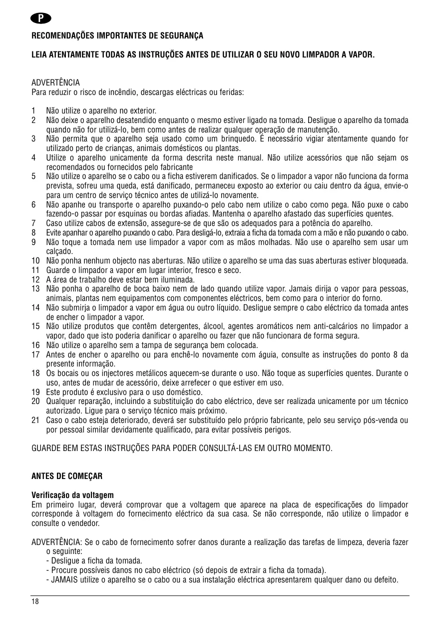 Em primeiro lugar, devera comprovar que a voltagem que aparece na placar de especificações do limpador corresponde à voltagem do fornecimento eletrico da sua casa. Se não correponde, não utilize o limpador e consulte o vendedor.