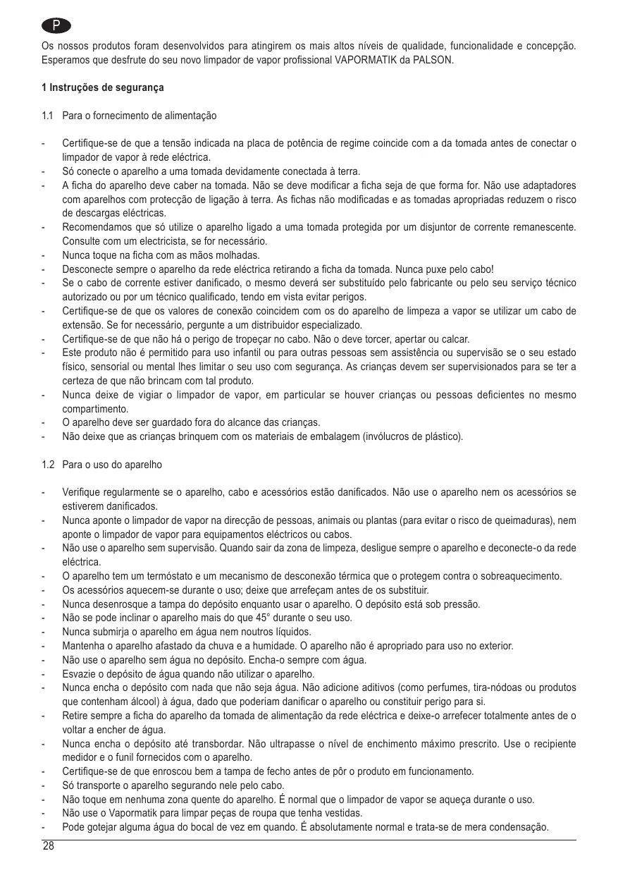 Os nossois produtos foram desenvolvidos para atingirem os mais altos niveis de qualidade, funcionalidade e concepcao. Esperamos que desfrute do seu novo limpador de vapor professional VAPFORMATIK da PALSON.