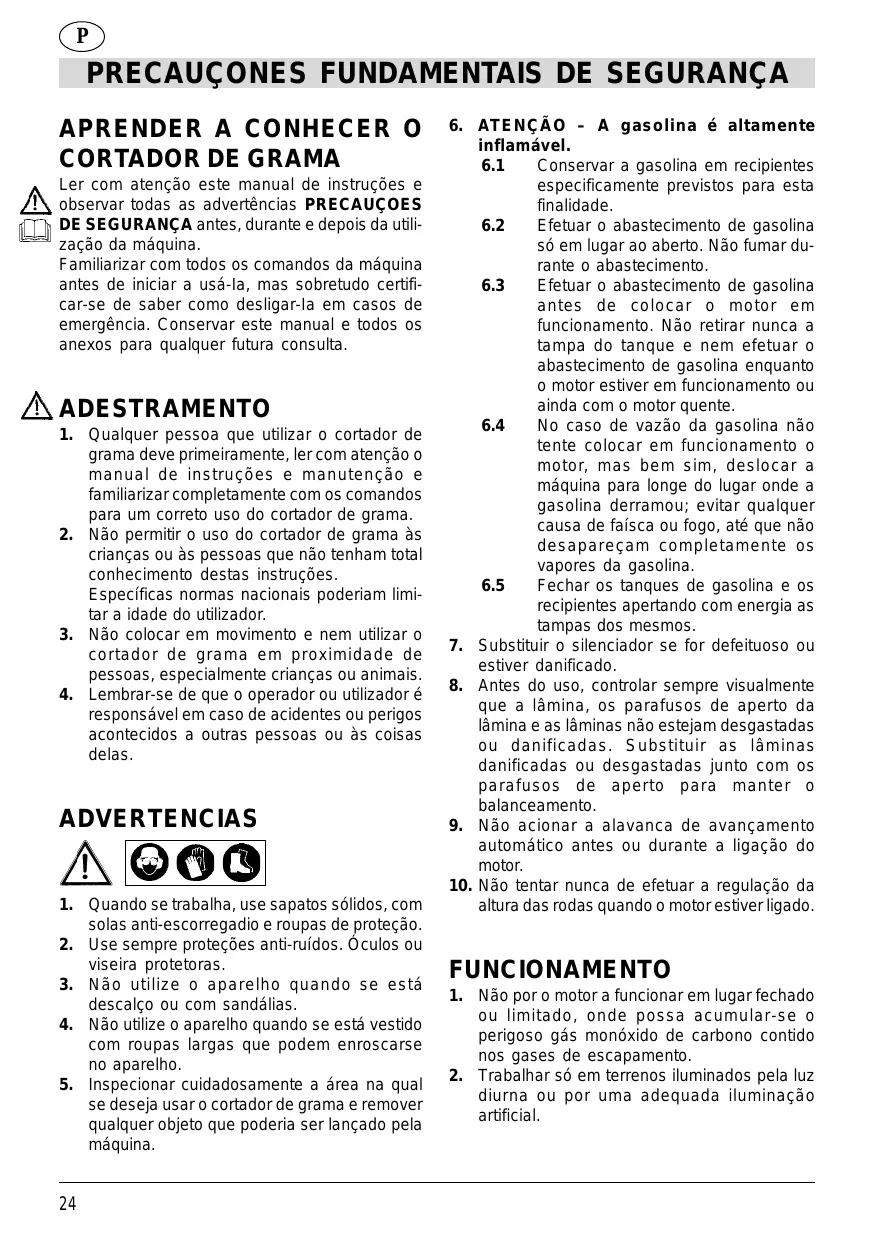 Cualquier persona, antes de utilizar la cortacéspedes, tiene que leer atentamente el presente manual de instrucciones y mantenimiento y familiarizarse bien con los mandos para un empleo correcto de la cortacéspedes. Qualquer pessoa que utilize a corta relvas, deve primeiramente, ler com atenção o manual de instruções e manutenção e familiarizarse completamente com os comandos para um uso correcto uso da corta relvas. GEVAAR - Alvorens de machine schoon te maken of onderhoud of reparaties uit te voeren, moet u controleren of het snijblad en alle andere bewegende delen volledig tot stilstand zijn gekomen. Koppel de bougiekabel af en houd deze weg van de bougie, om zo een ongewenste inschakeling van de machine te voorkomen. PELIGRO - Antes de efectuar la limpieza, el mantenimiento o la inspección hay que asegurarse de que la cuchilla y todas las otras piezas en movimiento estén completamente paradas. Después hay que desconectar el cable de la bujía y alejarlo de la misma para evitar que el motor se pueda poner en marcha de manera accidental. PERIGO - Antes de efetuar a limpeza, a manutenção ou a inspeção, certificar-se de que a lâmina e todas as outras partes em movimento estejam completamente paradas. Desligar o cabo da vela e afastá-lo da mesma vela, em modo de evitar uma ligação acidental.
