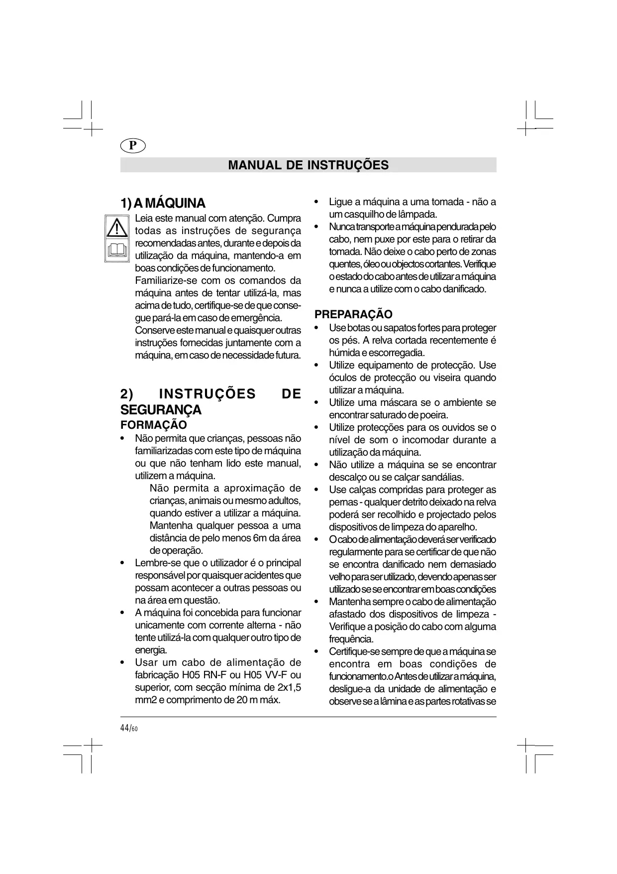 Cualquier persona, antes de utilizar la cortacéspedes, tiene que leer atentamente el presente manual de instrucciones y mantenimiento y familiarizarse bien con los mandos para un empleo correcto de la cortacéspedes. Qualquer pessoa que utilize a corta relvas, deve primeiramente, ler com atenção o manual de instruções e manutenção e familiarizarse completamente com os comandos para um uso correcto uso da corta relvas. Sachez que l'utilisateur est responsable des accidents ou dangers subis par des tiers ou infligés à des biens. Votre machine est conçue pour être utilisée sur courant alternatif (secteur) uniquement. Ne tentez pas de l'utiliser sur un autre type de courant. Utiliser un câble d'alimentation de type H05 RN-F, H05 VV-F ou supérieur, avec une section minimale de 2x1,5 mm2 et une longueur maxi de 20 m.
