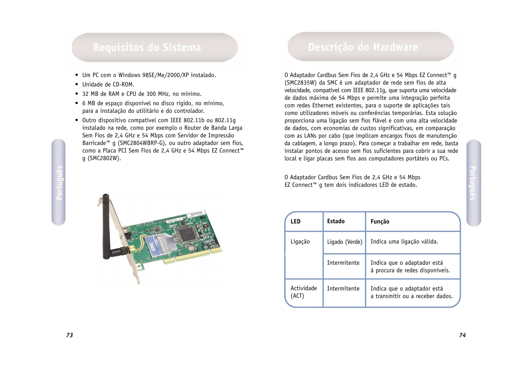 Um PC com o Windows 98SE/Me/2000/XP instalado. Unidade de CD-ROM. 32 MB de RAM e CPU de 300 MHz, no minimo. 6 MB de espaço disponivel no disco rigido, no minimo, para a instalaçäo do utilitério e do controlador. Outro dispositivo compativel com IEEE 802.11b ou 802.11g instalado na rede, como por exemplo o Router de Banda Larga Sem Fios de 2,4 GHz e 54 Mbps com Servidor de Impressäo Barricade"” g (SMC2804WBRP-G), ou outro adaptador sem fios, como a Placa PCI Sem Fios de 2,4 GHz e 54 Mbps EZ Connect" g (SMC2802W). © Adaptador Cardbus Sem Fios de 2,4 GHz e 54 Mbps EZ Connect" q (SMC2835W) da SMC é um adaptador de rede sem fios de alta velocidade, compativel com IEEE 802.11g, que suporta uma velocidade de dados mâxima de 54 Mbps e permite uma integraçäo perfeita com redes Ethernet existentes, para o suporte de aplicaçües tais como utilizadores môveis ou conferências temporärias. Esta soluçäo proporciona uma ligaçäo sem fios fiâvel e com uma alta velocidade de dados, com economias de custos significativas, em comparaçäo com as LANSs por cabo (que implicam encargos fixos de manutençäo da cablagem, a longo prazo). Para começar a trabalhar em rede, basta instalar pontos de acesso sem fios suficientes para cobrir a sua rede local e Ligar placas sem fios aos computadores portâteis ou PCs. © Adaptador Cardbus Sem Fios de 2,4 GHz e 54 Mbps EZ Connect" g tem dois indicadores LED de estado. (eo Estado Funçäo à Ligaçäo Ligado (Verde) | Indica uma ligaçäo välida. Intermitente | Indica que o adaptador est à procura de redes disponiveis. Actividade À Intermitente À Indica que o adaptador estä (ACT) a transmitir ou a receber “4. )