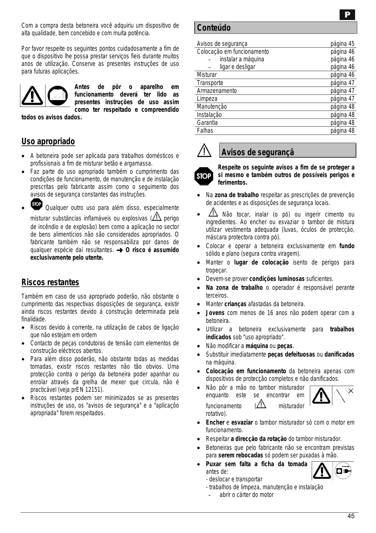 Com à compra desta betoneira você adquiriu um dispositivo de alta qualidade, bem concebido e com muita poténcia. Por favor respeite os seguintes pontos cuidadosamente a fim de que o dispositivo lhe possa prestar serviços fieis durante muitos anos de utiizaçäo. Conserve as presentes instruçôes de uso para futuras aplicaçües. Antes de pôr o aparelho em A funcionamento deverd ter lido as presentes instruçôes de uso assim como ter respeitado e compreendido todos os avisos dados. Uso apropriado + À betoneira pode ser aplicada para trabalhos domésticos e profissionais a fim de misturar betäo e argamassa. + Faz parte do uso apropriado também o cumprimento das condiçôes de funcionamento, de manutençäo e de instalaçäo prescritas pelo fabricante assim como o seguimento dos avisos de segurança constantes das instruçôes. . Qualquer outro uso para além disso, especialmente misturar substâncias inflamäveis ou explosivas VAN perigo de incêndio e de explosäo) bem como a aplicaçäo no sector de bens alimenticios näo säo considerados apropriados. © fabricante também nâo se responsabiliza por danos de qualquer espécie daf resultantes. > O risco é assumido exclusivamente pelo utente. Riscos restantes Também em caso de uso apropriado poderäo, näo obstante o cumprimento das respectivas disposiçües de segurança, existir ainda riscos restantes devido 4 construçäo determinada pela finalidade. + Riscos devido à corrente, na utilizaçäo de cabos de ligaçäo que néo estejam em ordem e _ Contacto de peças condutoras de tensäo com elementos de construçäo eléctricos abertos. + Para além disso poderäo, nâo obstante todas as medidas tomadas, existir riscos restantes nâo to obvios. Uma protecçäo contra o perigo da betoneira poder apanhar ou enrolar através da grelha de mexer que circula, näo é practicével (veja pr£N 12151). < Riscos restantes podem ser minimizados se as presentes instruçôes de uso, os ‘avisos de segurança" e à "aplicaçüo apropriada" forem respeitados. Conteüdo Avisos de segurança pägina 45 Colocaçäo em funcionamento pégina 46 - _instalar à mäquina pégina 46 -__ligare desligar pégina 46 Misturar pägina 46 Transporte pägina 47 Armazenamento pägina 47 Limpeza pägina 47 Manutençäo pägina 48 Instalaçäo pägina 48 Garantia pégina 48 Falhas pégina 48 VAN Avisos de segurançà si mesmo e também outros de possiveis perigos e Respeite os seguinte avisos a fim de se proteger a (Sror ferimentos.