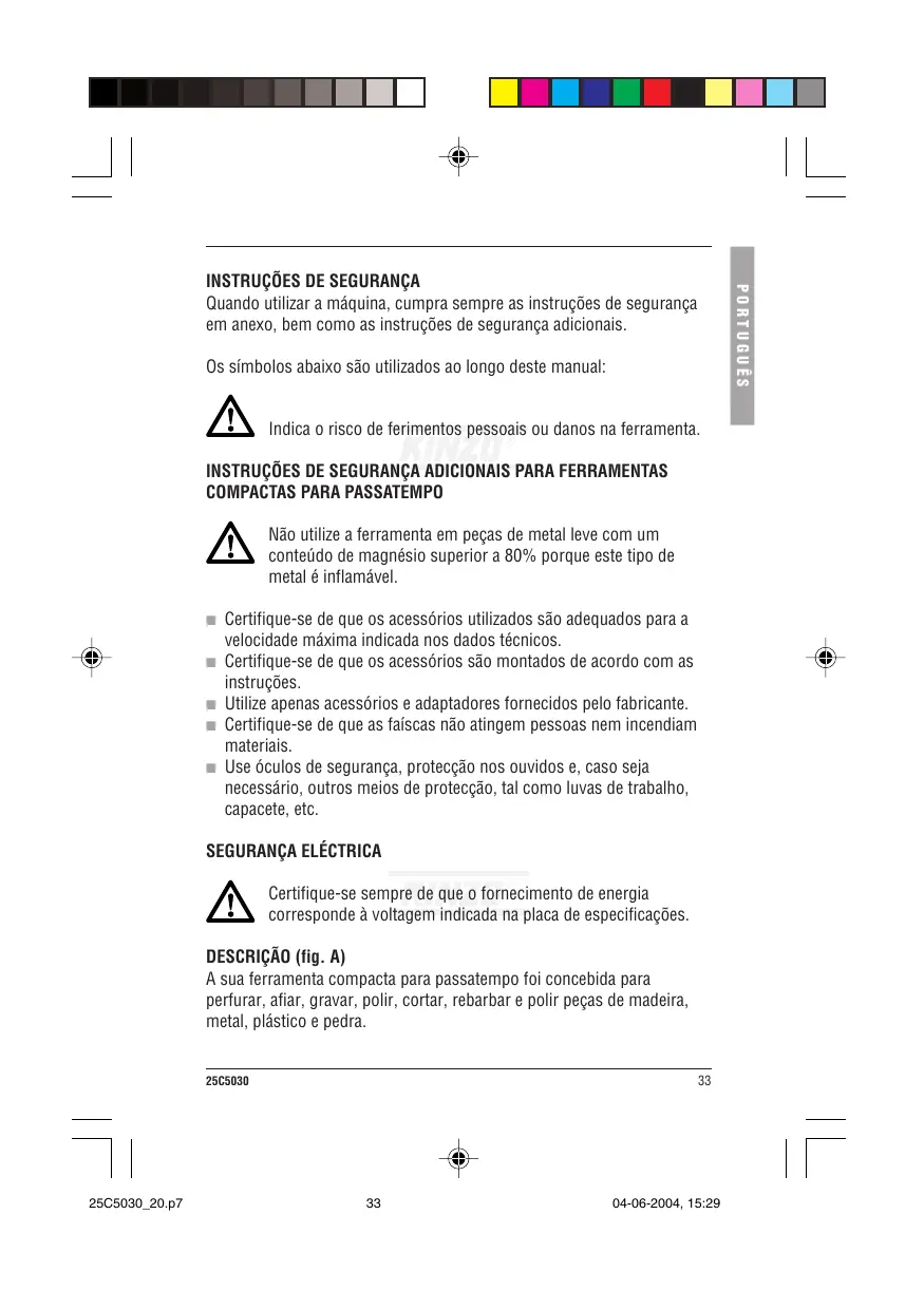 Certifique-se sempre de que o fornecimento de energia corresponde à voltagem indicada na placa de especificações. DESCRIÇÃO (fig. A) A sua ferramenta compacta para passatempo foi concebida para perfurar, afiar, gravar, polir, cortar, rebarbar e polir peças de madeira, metal, plástico e pedra.