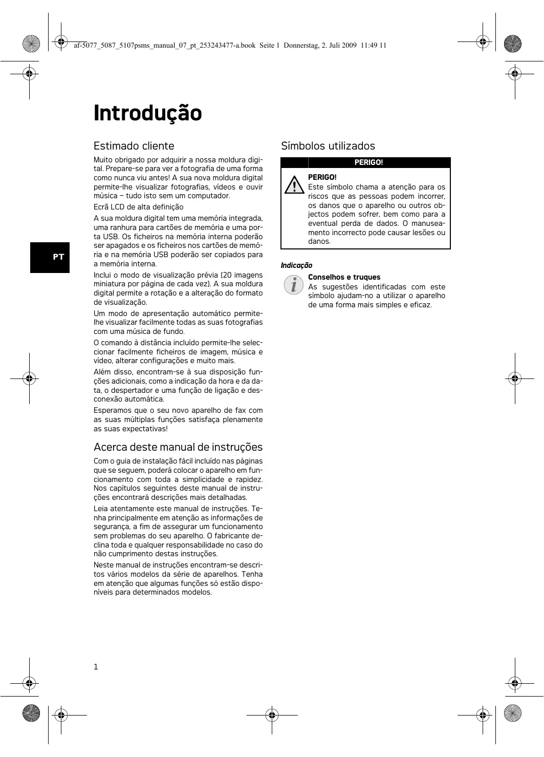 af-5077_5087_5107psms_manual_07_pt_253243477-a.book Seite 1 Donnerstag, 2. Juli 2009 11:49 11 Introdução Estimado cliente Muito obrigado por adquirir a nossa moldura digital. Prepare-se para ver a fotografia de uma forma como nunca viu antes! A sua nova moldura digital permite-lhe visualizar fotografias, vídeos e ouvir música – tudo isto sem um computador. Símbolos utilizados Aviso contra riscos PERIGO! PERIGO! Este símbolo chama a atenção para os riscos que as pessoas podem incorrer, os danos que o aparelho ou outros objectos podem sofrer, bem como para a eventual perda de dados. O manuseamento incorrecto pode causar lesões ou danos. Ecrã LCD de alta definição Memória