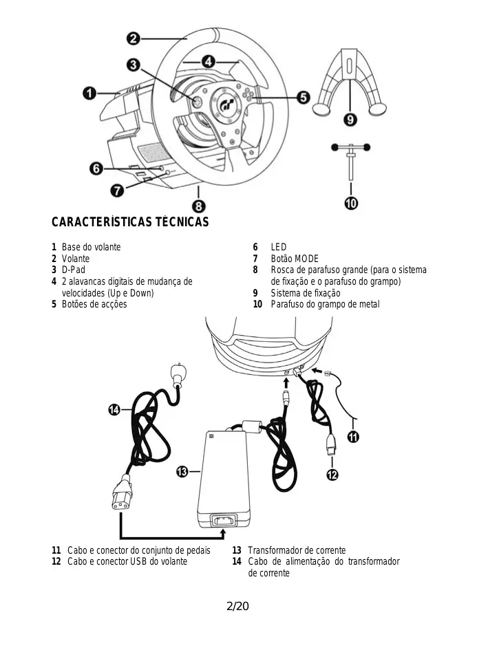 Base do volante Volante D-Pad 2 alavancas digitais de mudança de velocidades (Up e Down) 5 Botões de acções 11 Cabo e conector do conjunto de pedais 12 Cabo e conector USB do volante LED Botão MODE Rosca de parafuso grande (para o sistema de fixação e o parafuso do grampo) 9 Sistema de fixação 10 Parafuso do grampo de metal 13 Transformador de corrente 14 Cabo de alimentação do transformador de corrente 2/20