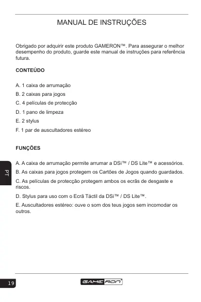 Encontre gratuitamente o manual do aparelho INITIAL PACK DSI GAMERON em formato PDF.